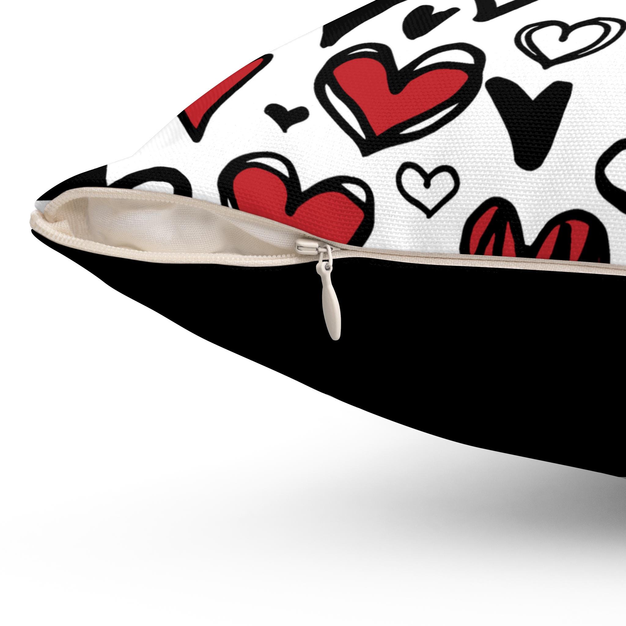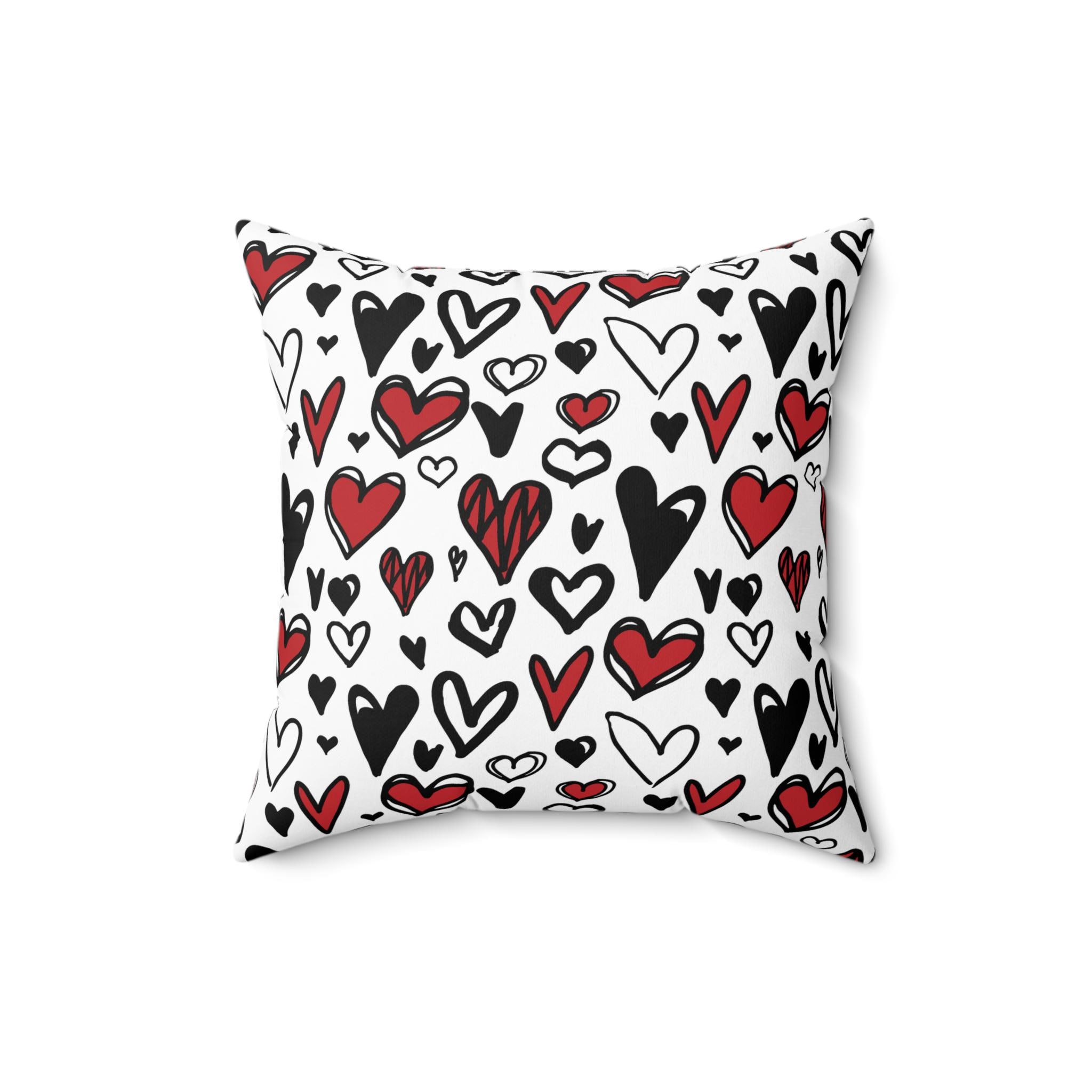A cozy, artful square pillow that brings playful, hand-drawn warmth to living spaces. The double-sided spun polyester cover showcases a whimsical scatter of red, black, and white hearts that feel both modern and handmade. Lightweight but structured, the pillow holds its shape without ironing and arrives with a vacuum-packed recycled polyester insert that gives an extra-plush, rounded finish once assembled. The concealed beige zipper keeps the silhouette clean while making it easy to remove the cover for refreshes. Tuck it into a reading nook, layer it on a sofa, or let it soften a bedside — it adds a touch of casual romance and graphic charm to everyday rooms.