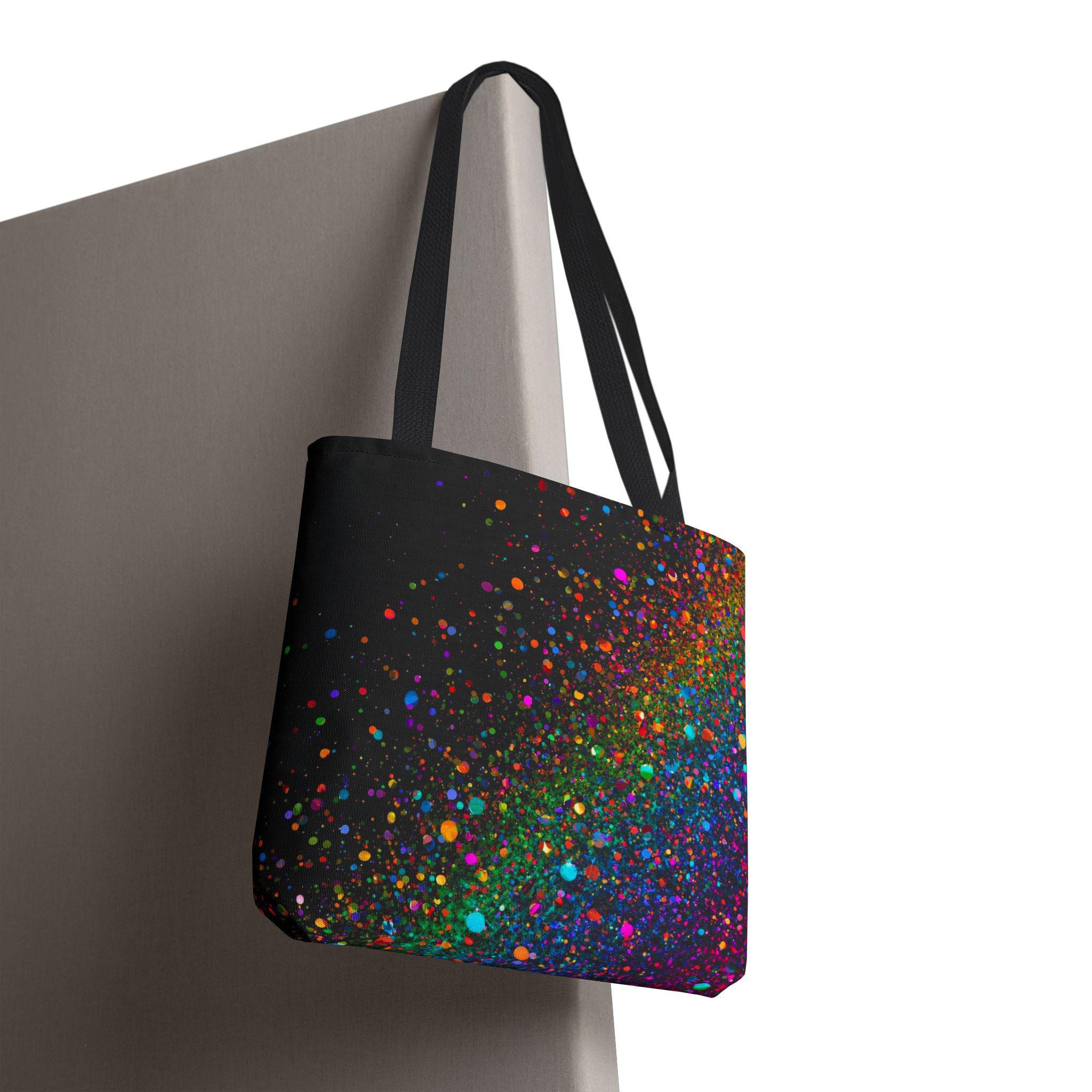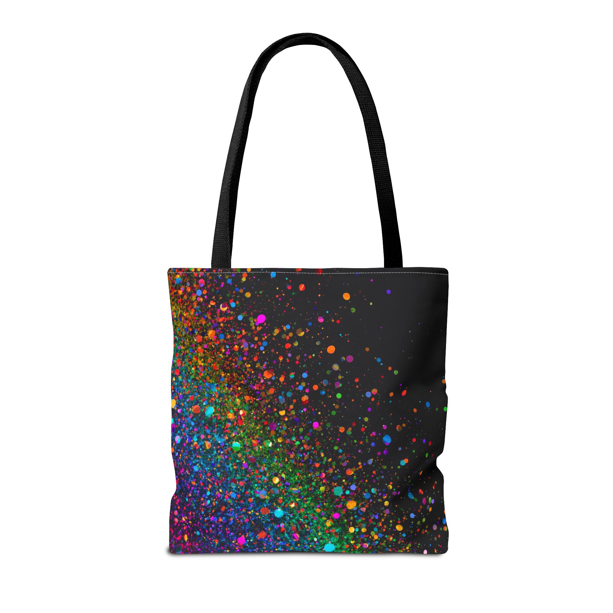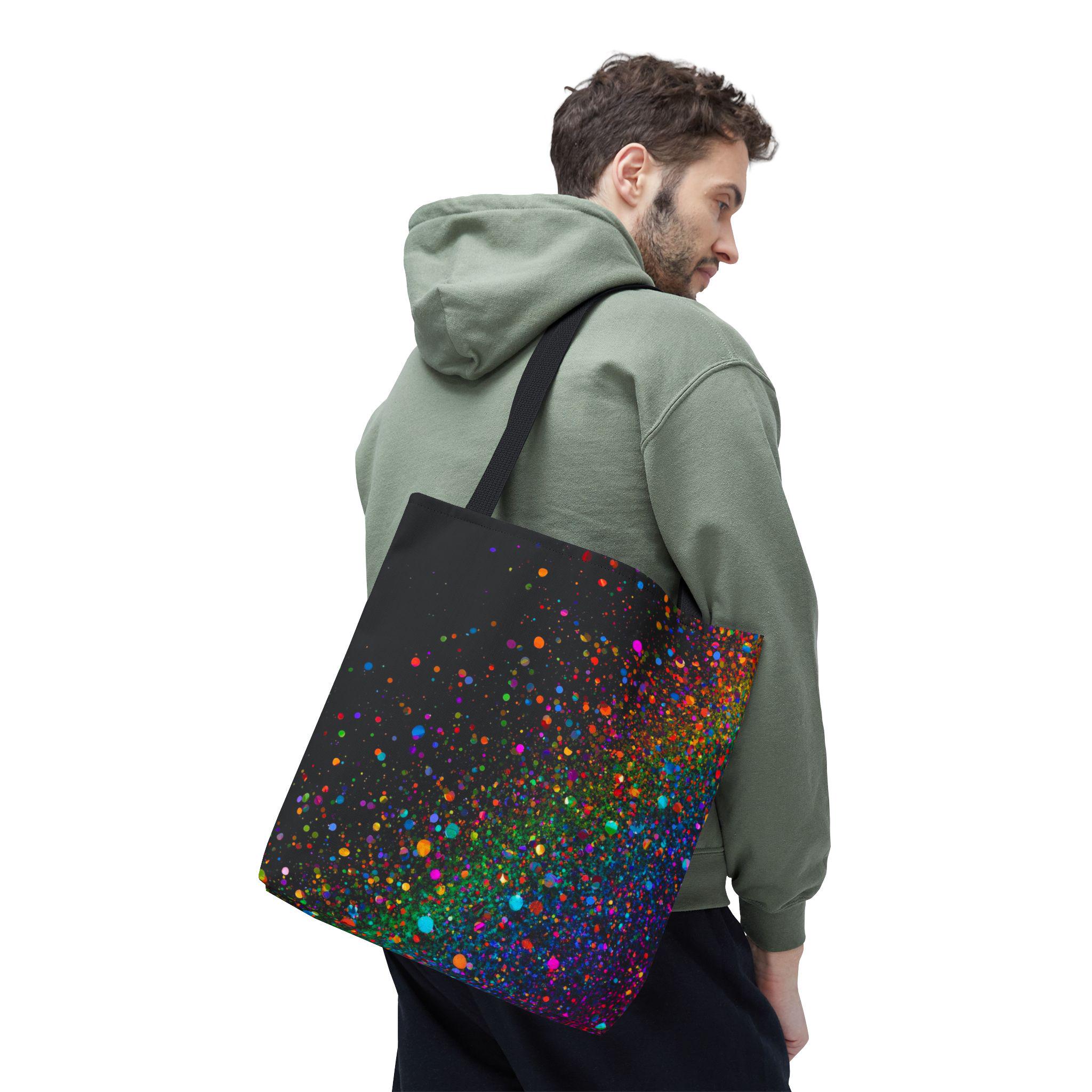 Carry a little burst of celebration with you every day. This tote folds around your shoulders like a soft night sky dusted with vivid confetti — neon specks of magenta, teal, orange and purple that feel energetic without shouting. It’s roomy enough for your market haul, sketchbook, or work essentials, and the boxed-corner construction gives it structure. The interior laminate protects against spills, and the reinforced handles hold steady when you’re loaded up. Bring it to festivals, studio sessions, or evening walks; it reads like quiet joy in motion and pairs effortlessly with casual layers and city rhythms.