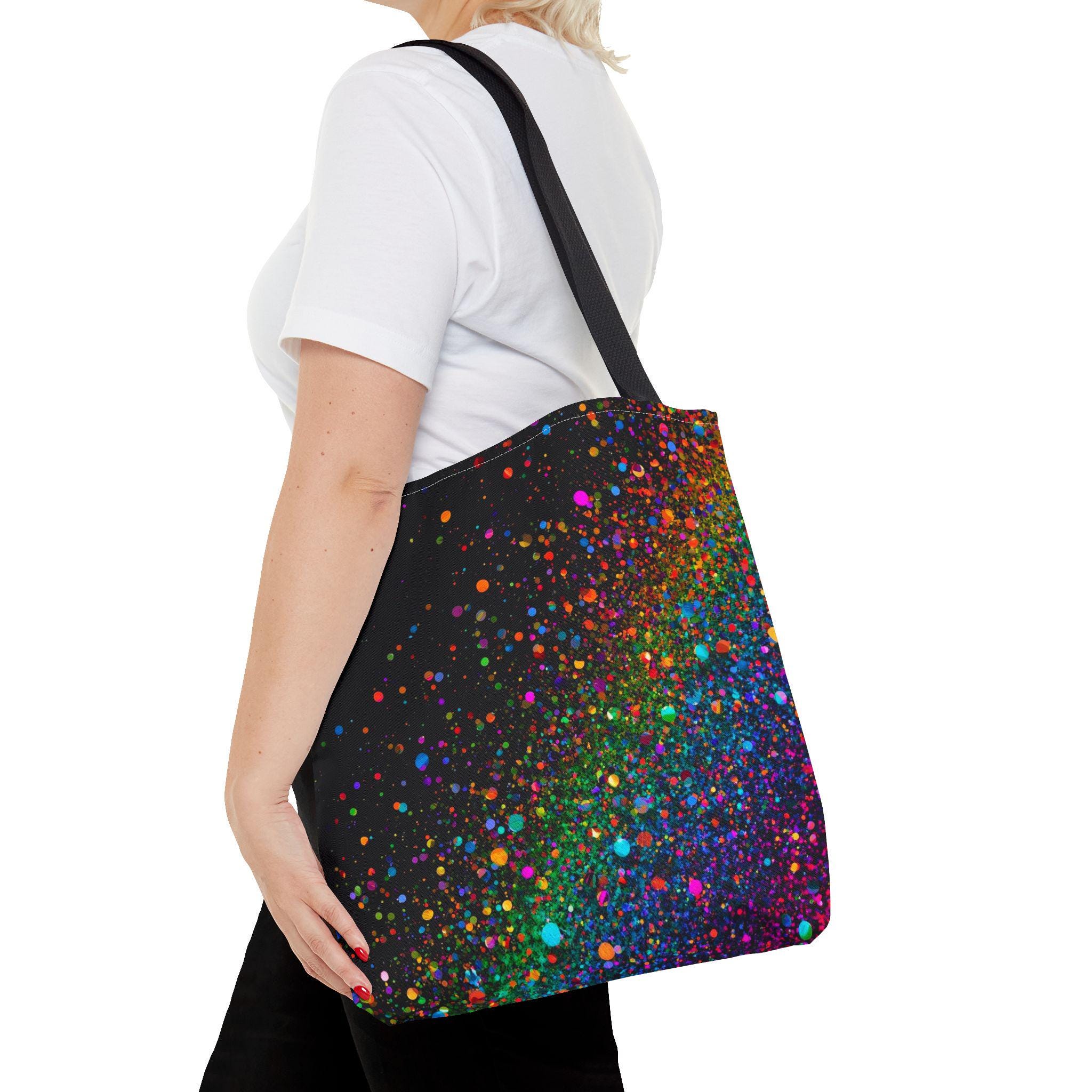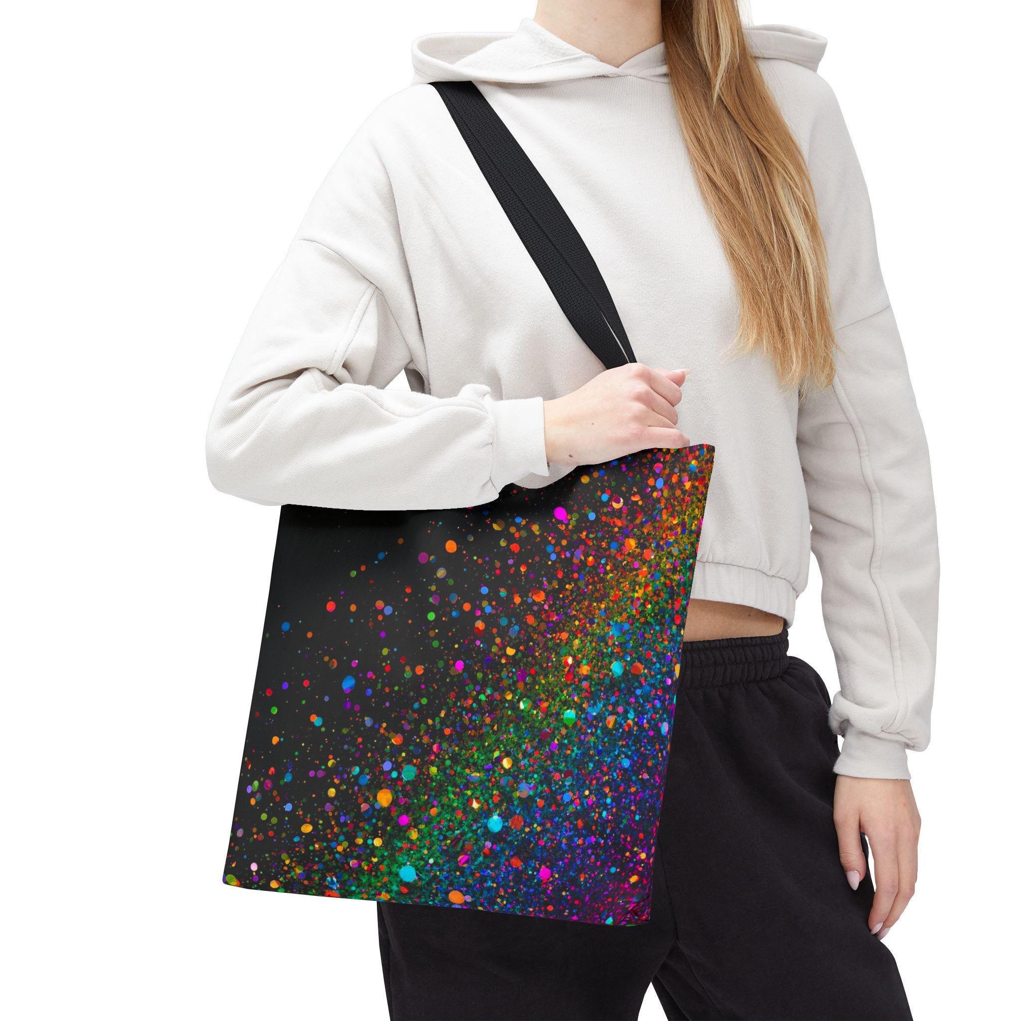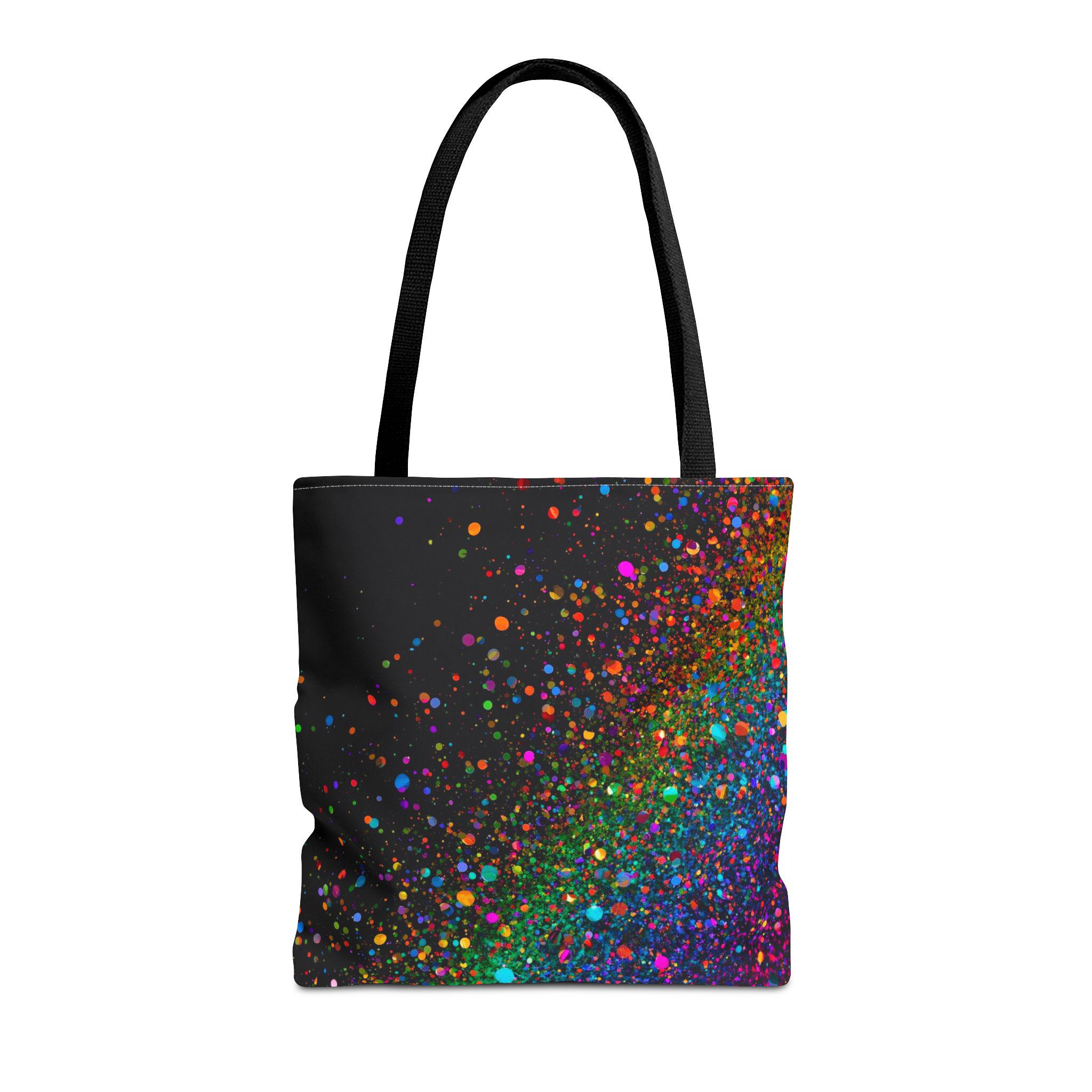 Carry a little burst of celebration with you every day. This tote folds around your shoulders like a soft night sky dusted with vivid confetti — neon specks of magenta, teal, orange and purple that feel energetic without shouting. It’s roomy enough for your market haul, sketchbook, or work essentials, and the boxed-corner construction gives it structure. The interior laminate protects against spills, and the reinforced handles hold steady when you’re loaded up. Bring it to festivals, studio sessions, or evening walks; it reads like quiet joy in motion and pairs effortlessly with casual layers and city rhythms.