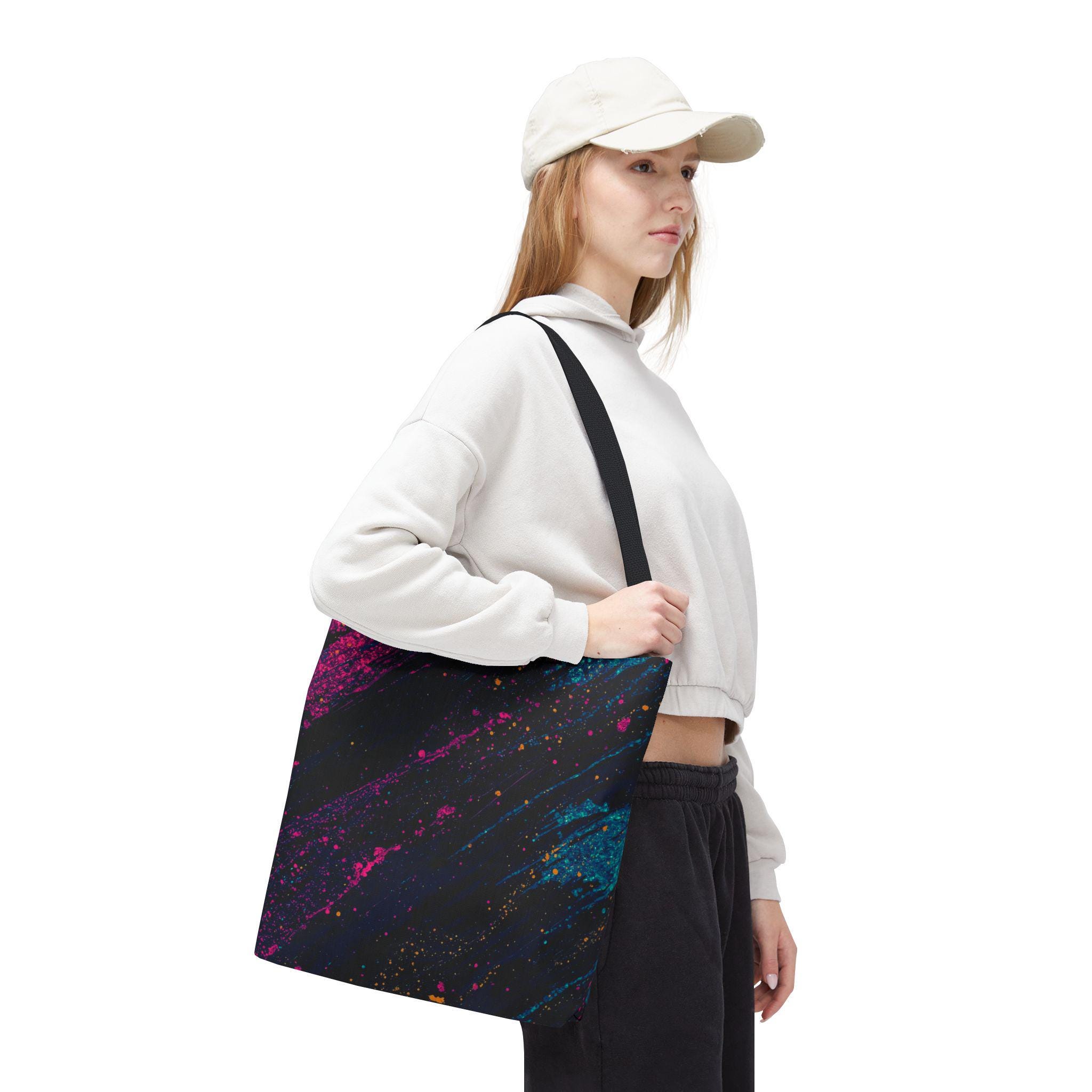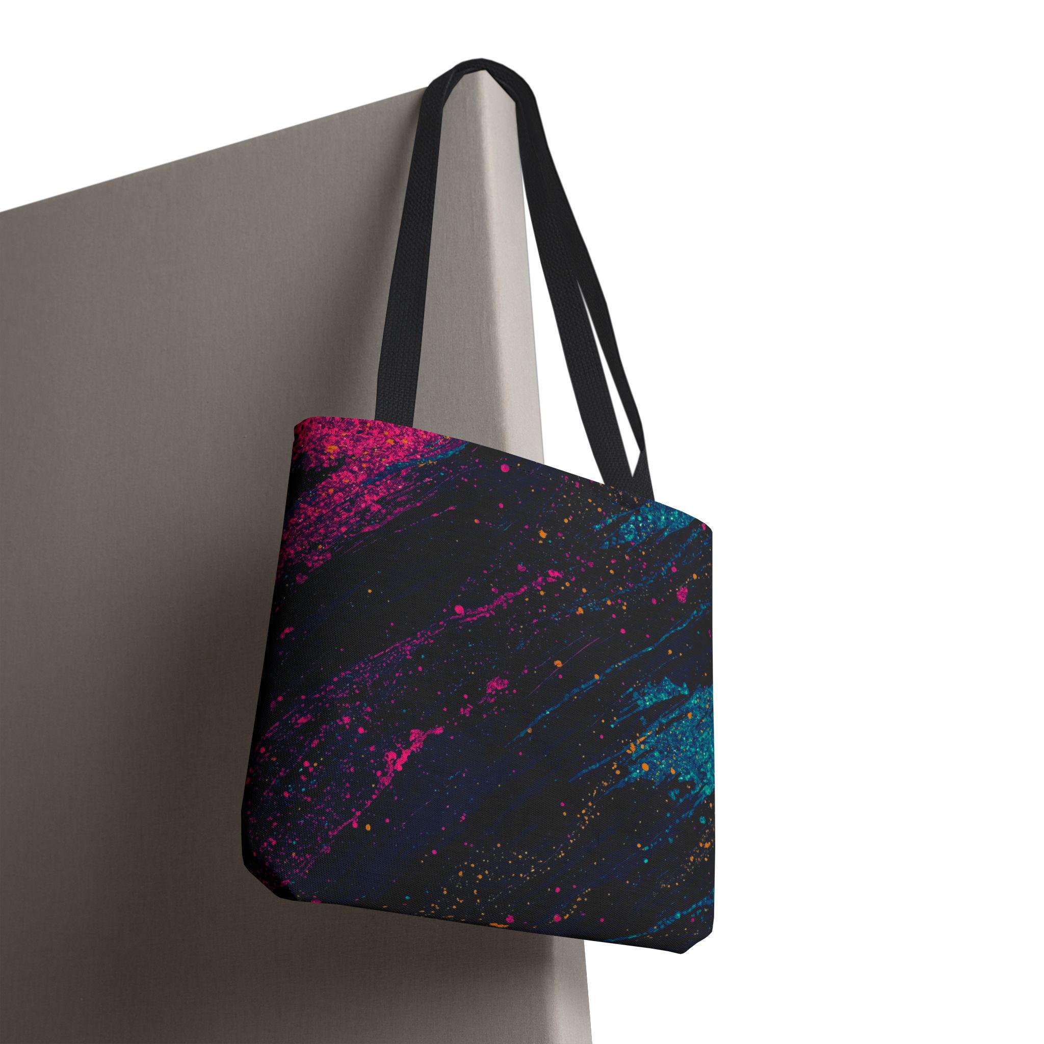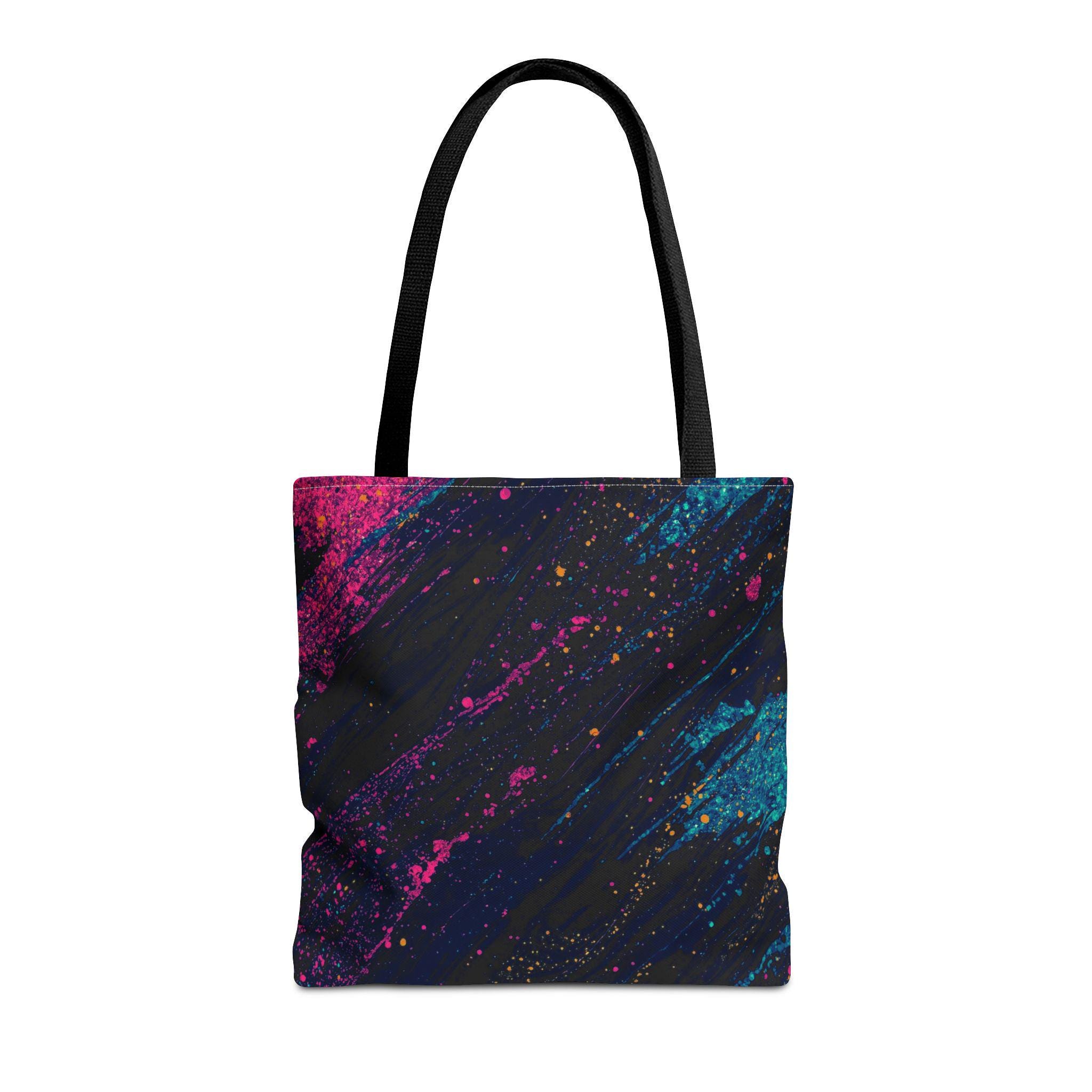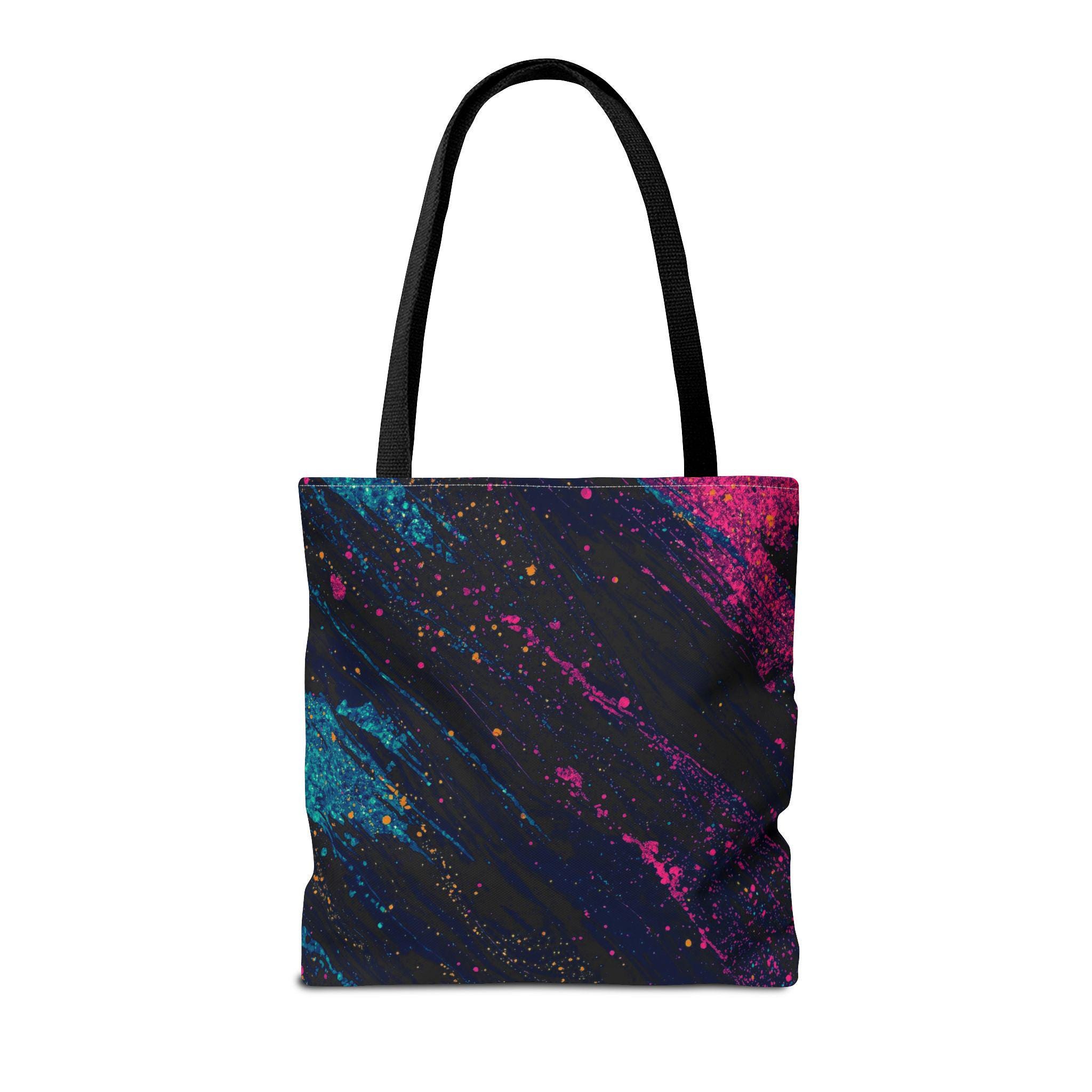 This vibrant tote brings bold color and everyday utility together. Deep charcoal brushstrokes form the backdrop for bright magenta and teal paint splashes that look like a midnight skyline caught in motion. The roomy, boxed-corner construction and reinforced handles mean you can carry books, groceries, or a sketchpad without worrying about wear. Lightweight polyester keeps the shape and dries quickly, while the non-woven laminate interior adds structure and protects contents.