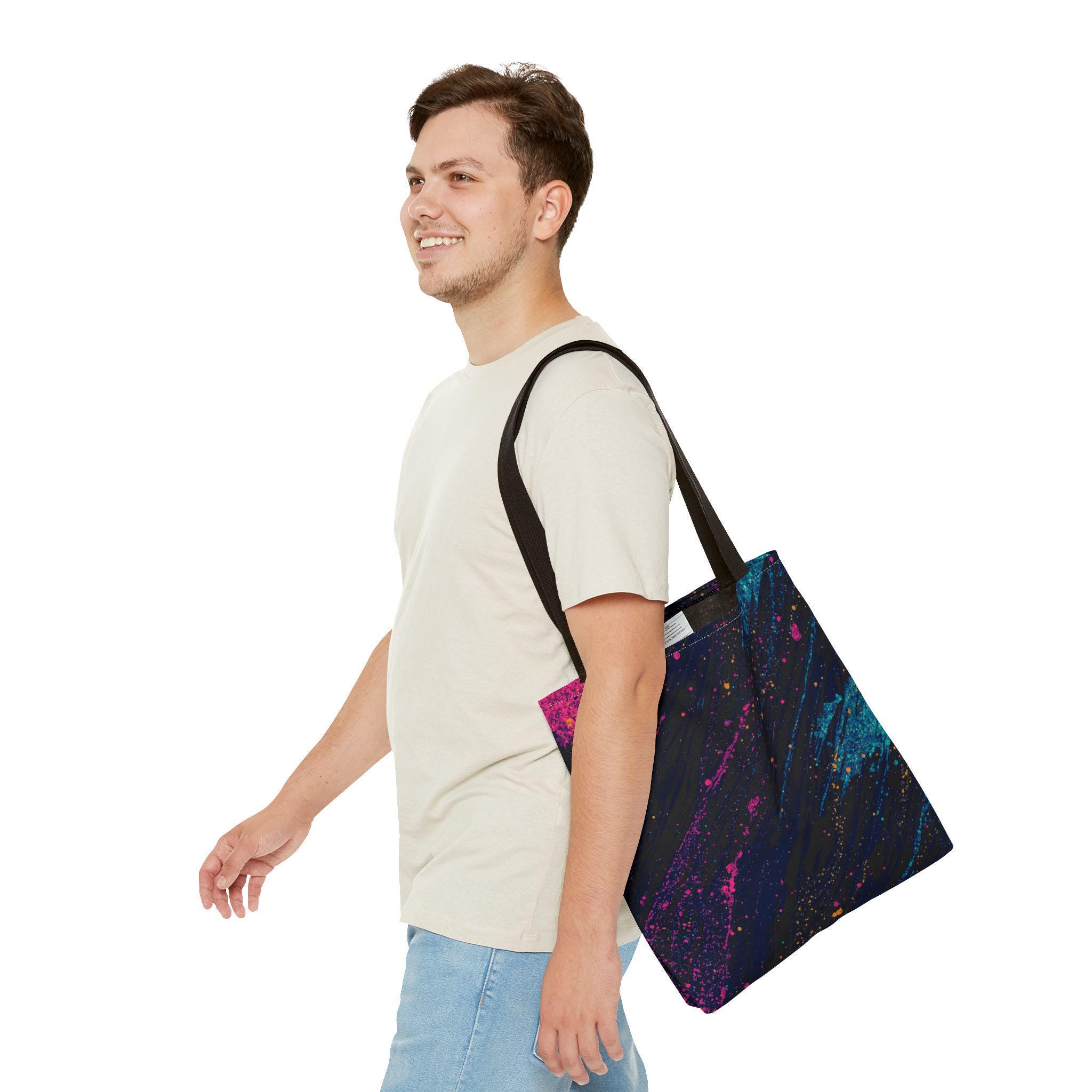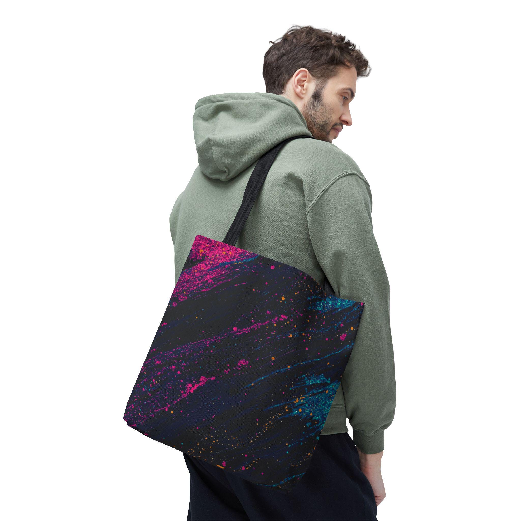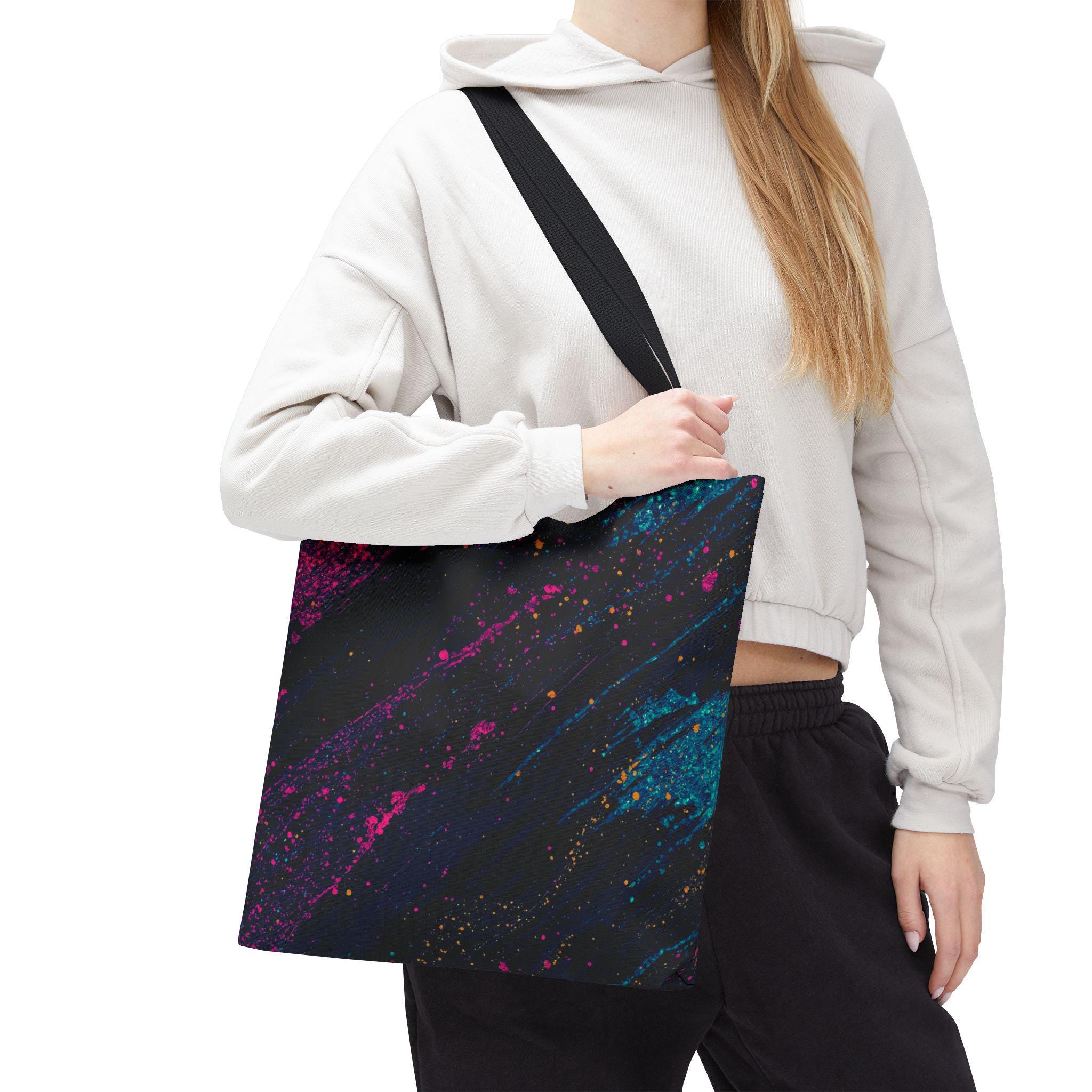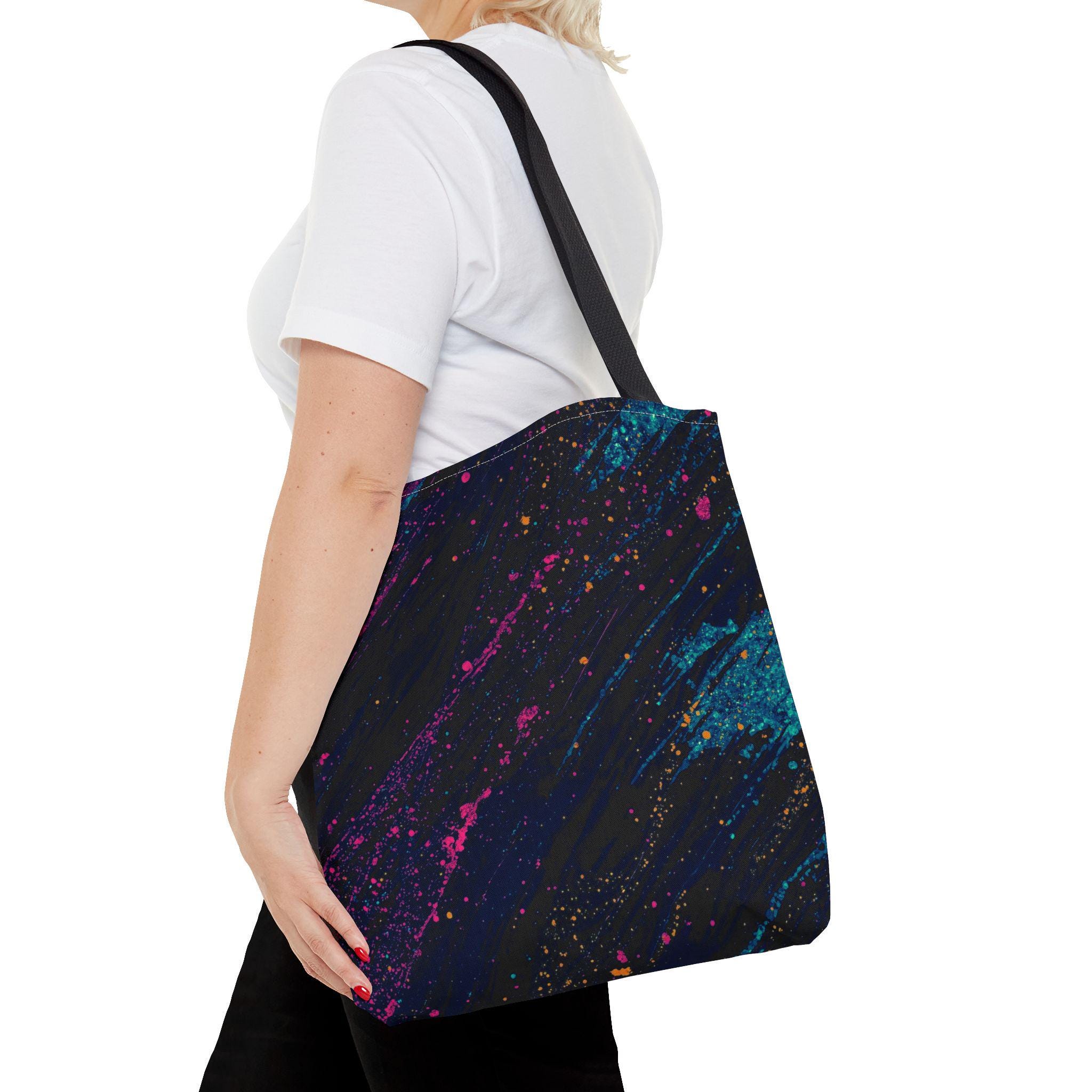 This vibrant tote brings bold color and everyday utility together. Deep charcoal brushstrokes form the backdrop for bright magenta and teal paint splashes that look like a midnight skyline caught in motion. The roomy, boxed-corner construction and reinforced handles mean you can carry books, groceries, or a sketchpad without worrying about wear. Lightweight polyester keeps the shape and dries quickly, while the non-woven laminate interior adds structure and protects contents.