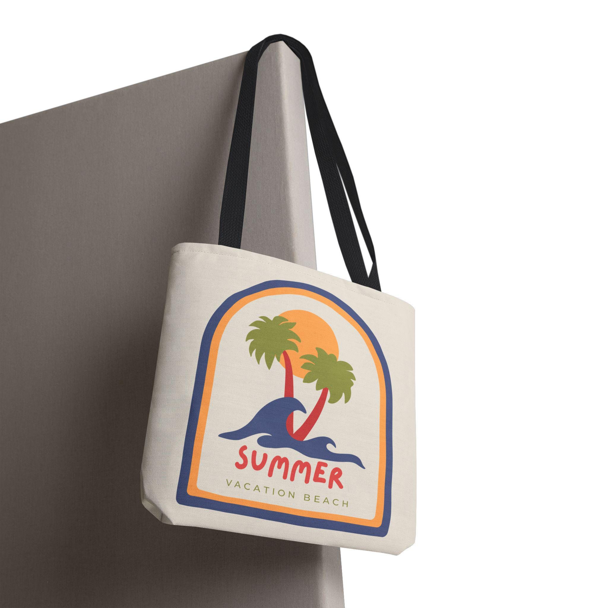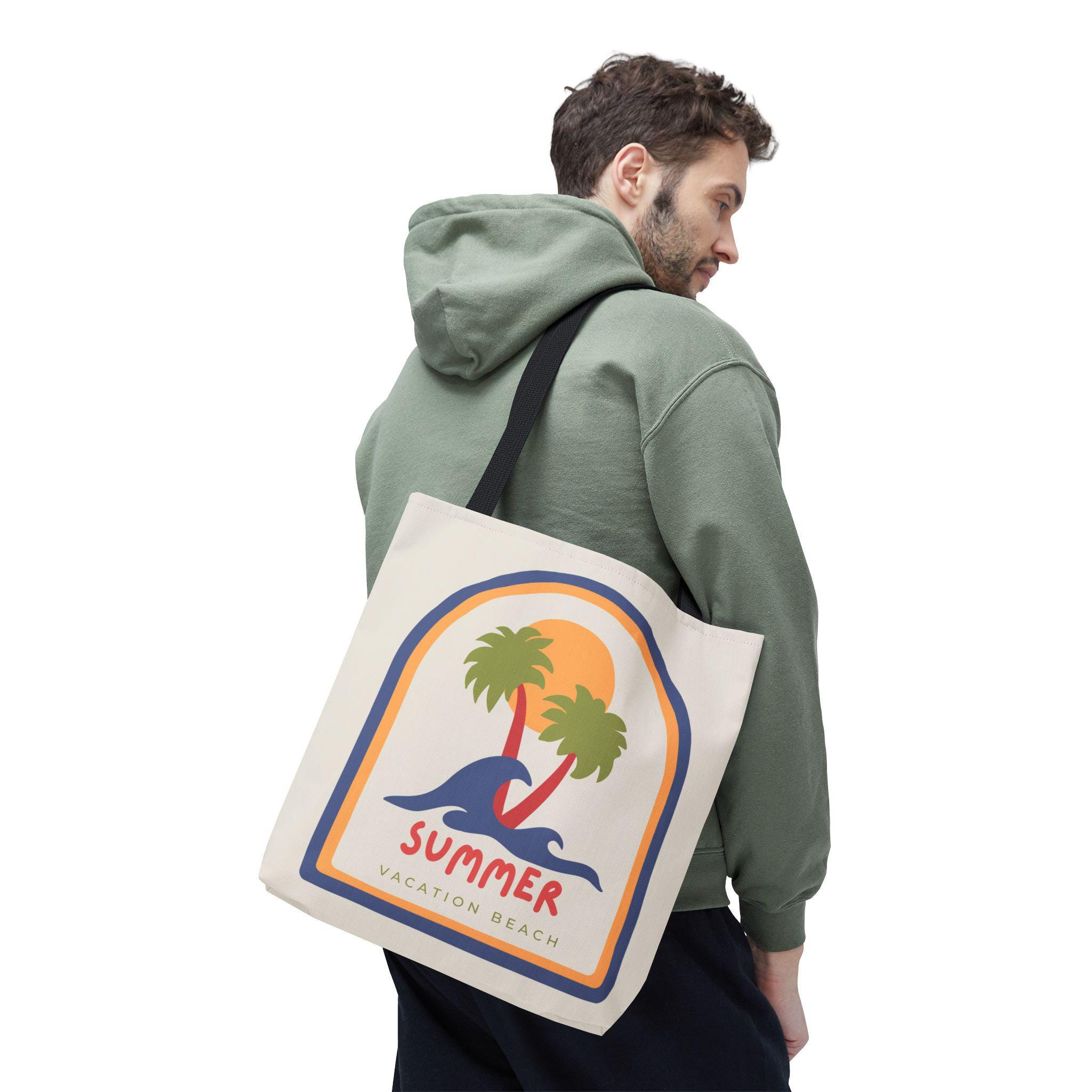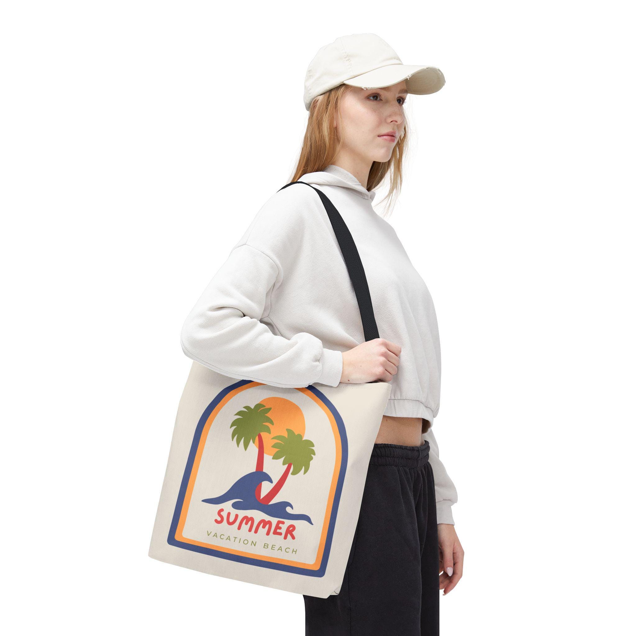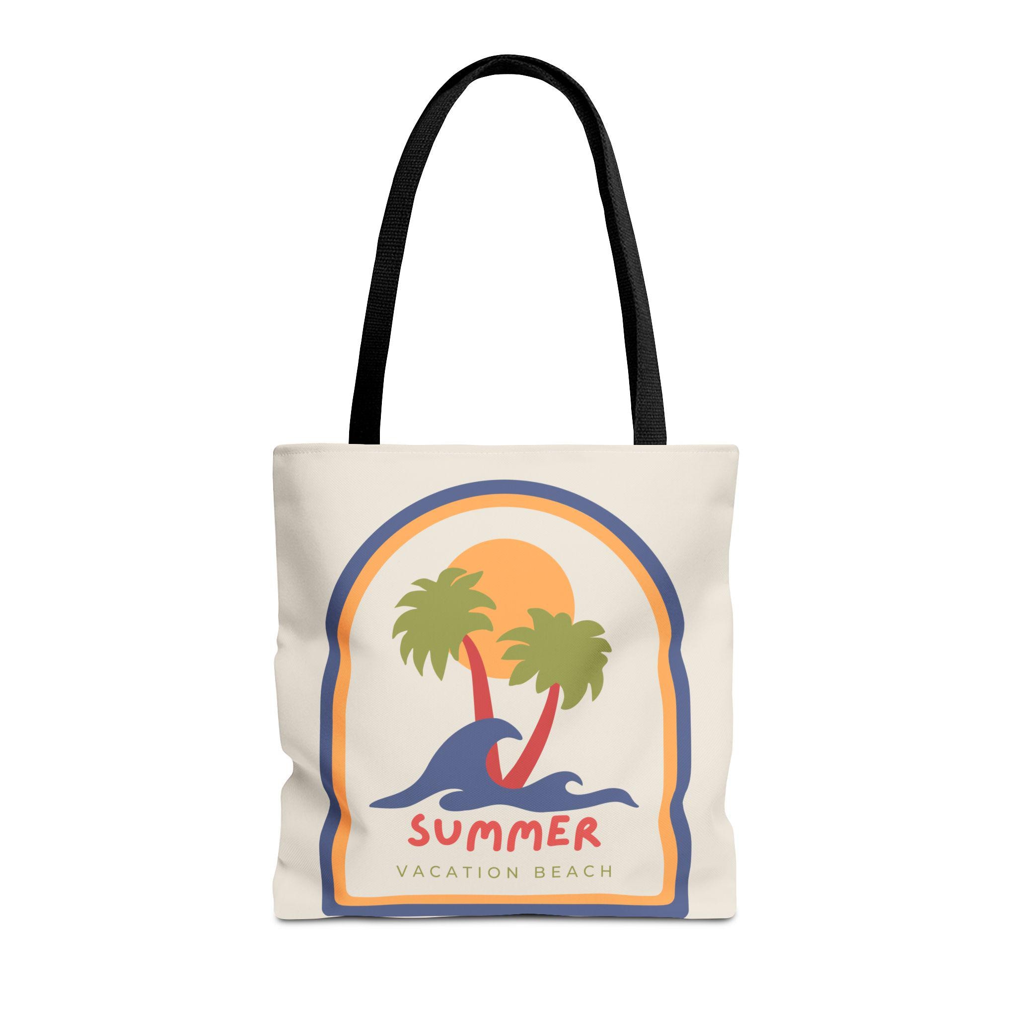 Lightweight, sturdy, and sunlit — this canvas-style tote brings a retro beach mood to everyday carry. The vintage-inspired graphic of palms, rolling waves, and a warm sunset sits on a soft cream field, while contrasting black handles add a modern edge. It holds groceries, a towel, or a stack of market finds without sagging thanks to reinforced stitching and boxed corners. Carry memories of slow summer mornings and boardwalk breezes wherever you go.