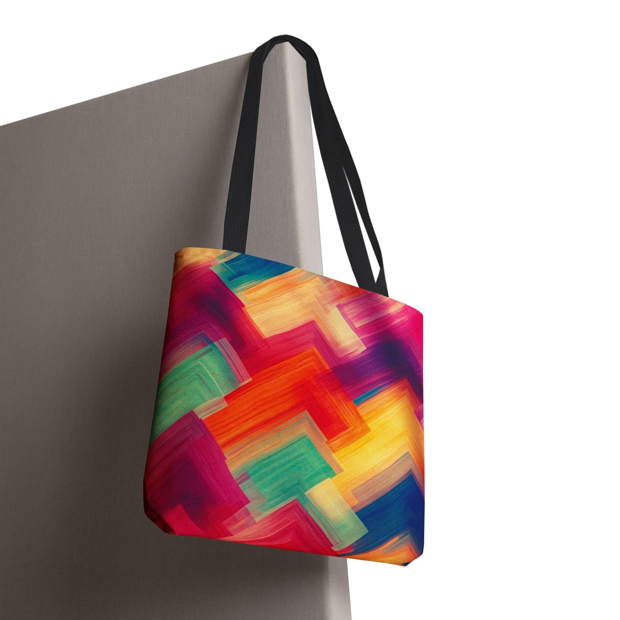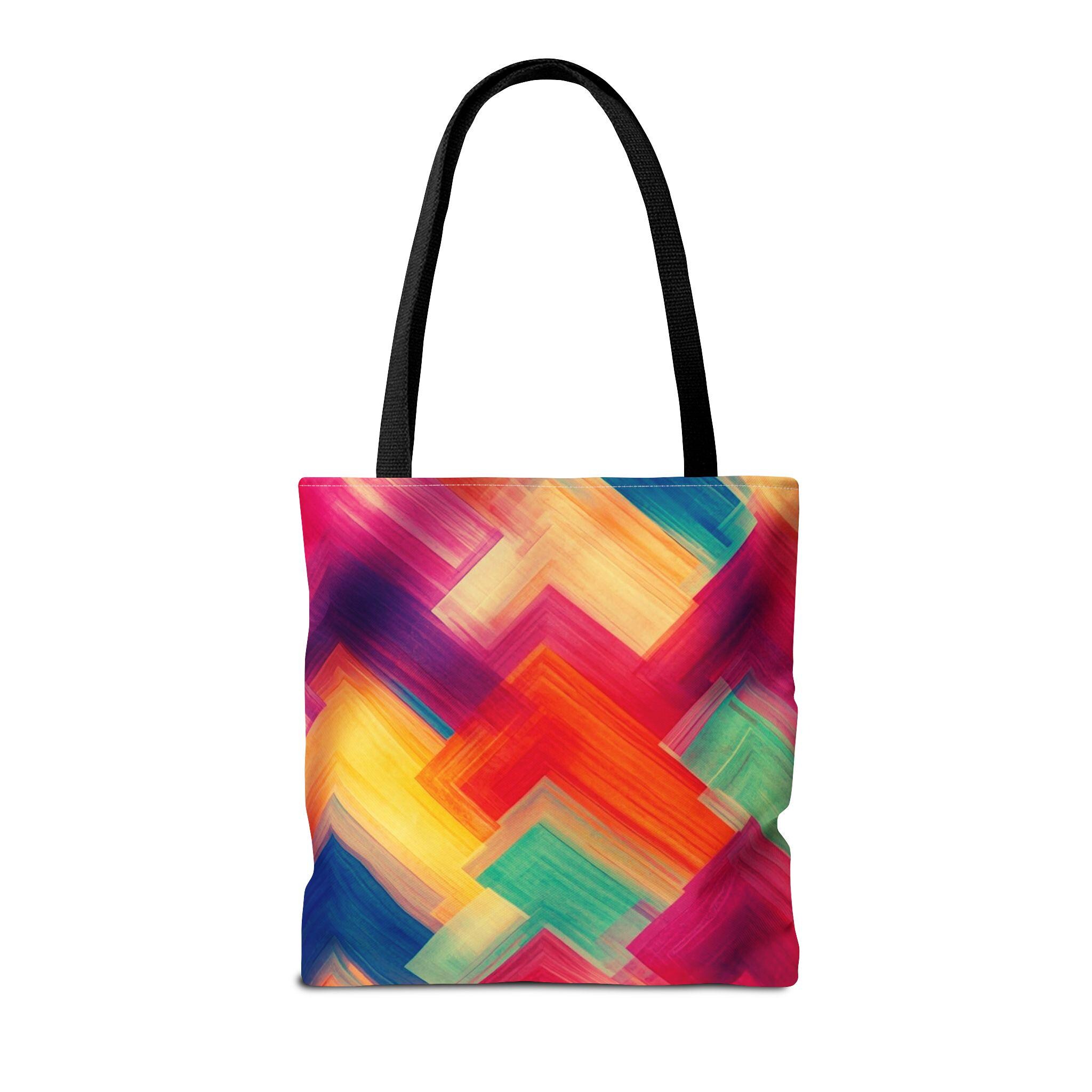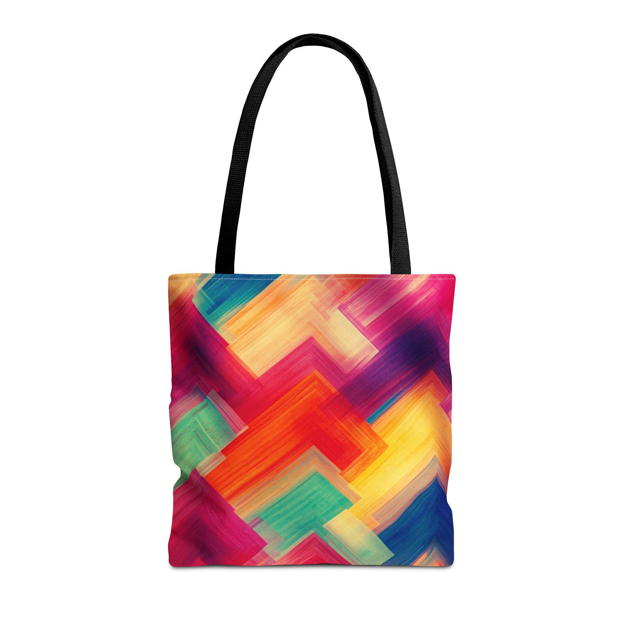 Bright, painterly strokes collide into a lively chevron pattern on this roomy tote — a little canvas of color you can carry everywhere. The medium-weight polyester holds its shape while the boxed corners give extra room for groceries, sketchbooks, or a market haul. Black cotton handles and reinforced stitching stand up to daily wear, and the smooth non-woven laminate interior keeps things tidy. It feels energetic and personal: the kind of bag you grab when you want your accessories to reflect a sunny, creative mood.