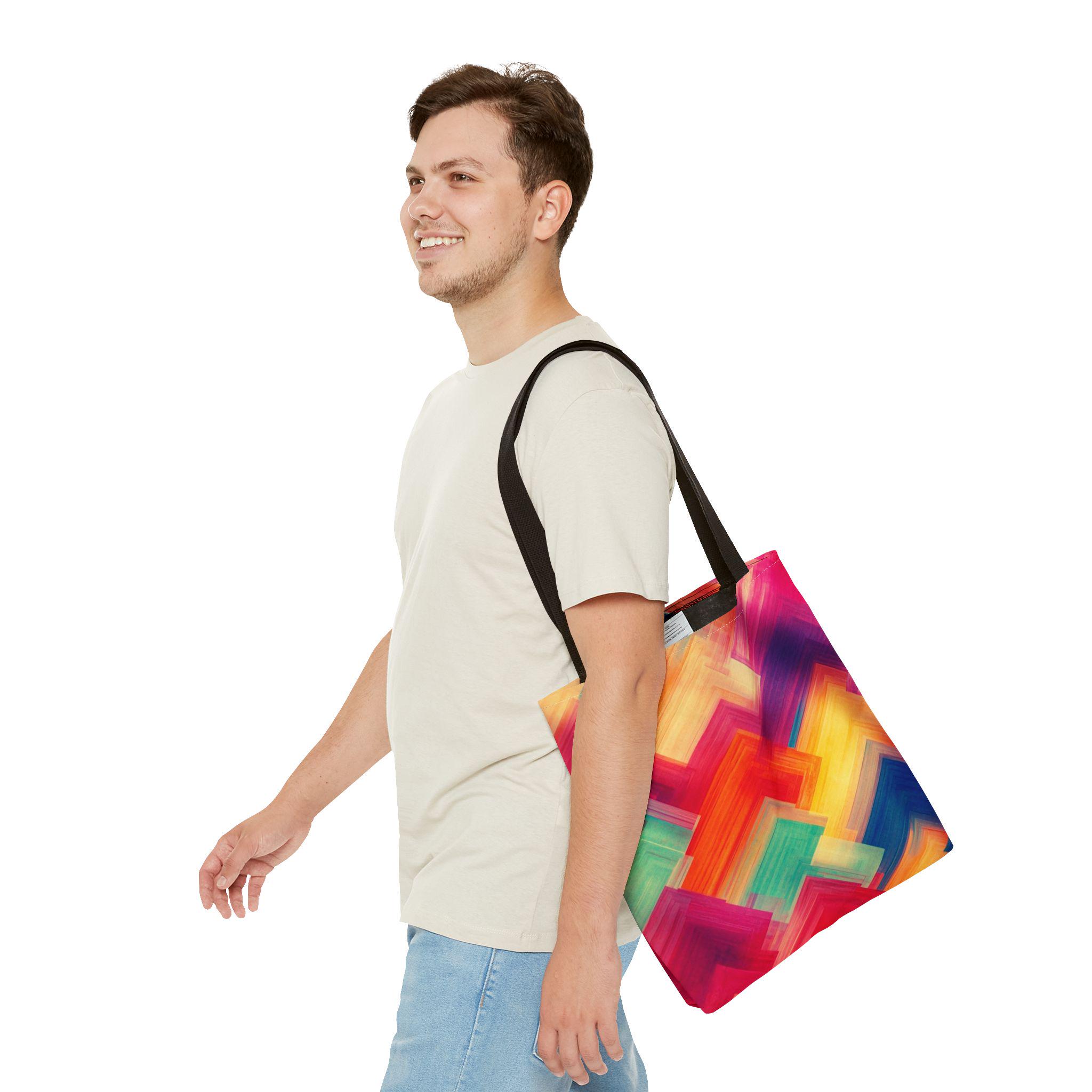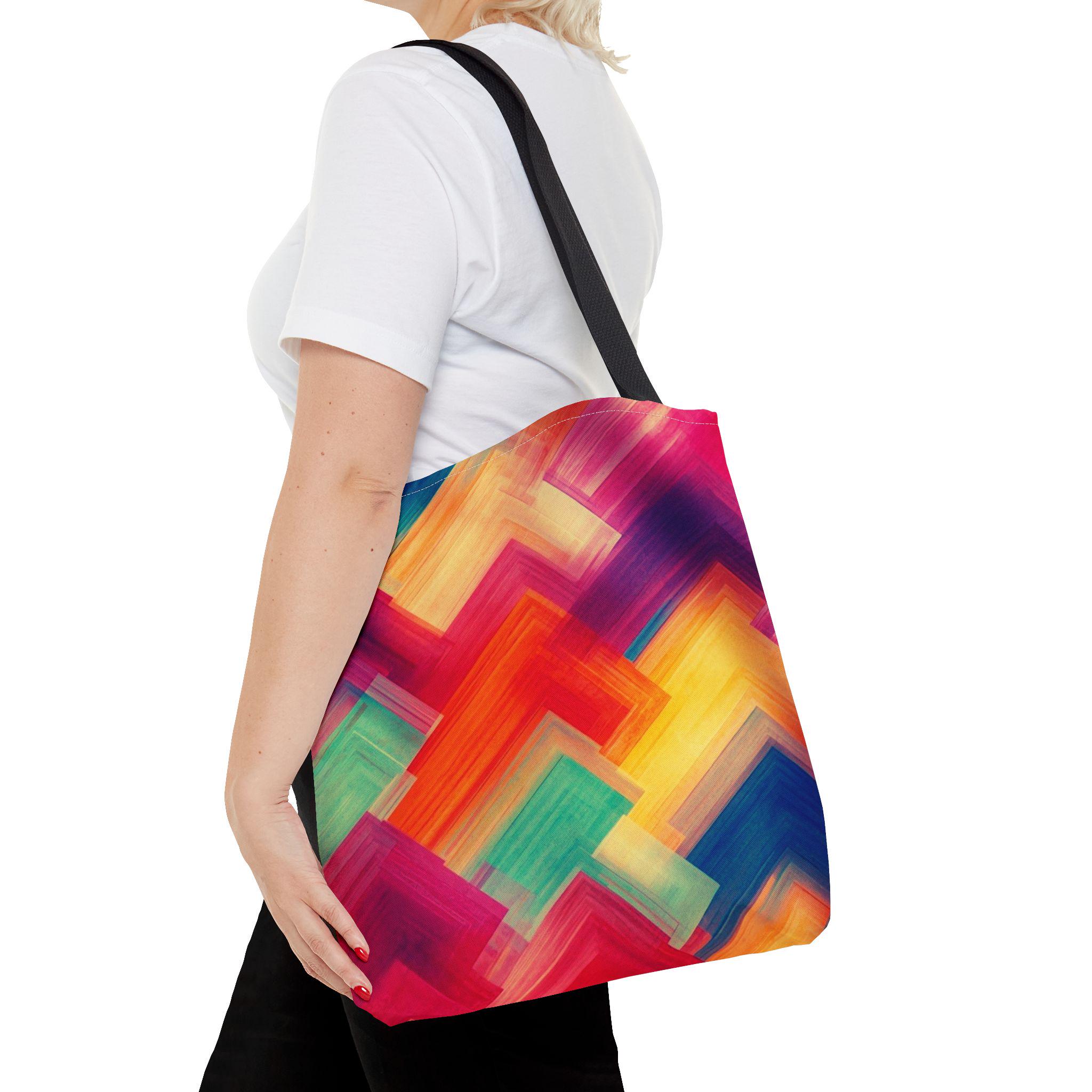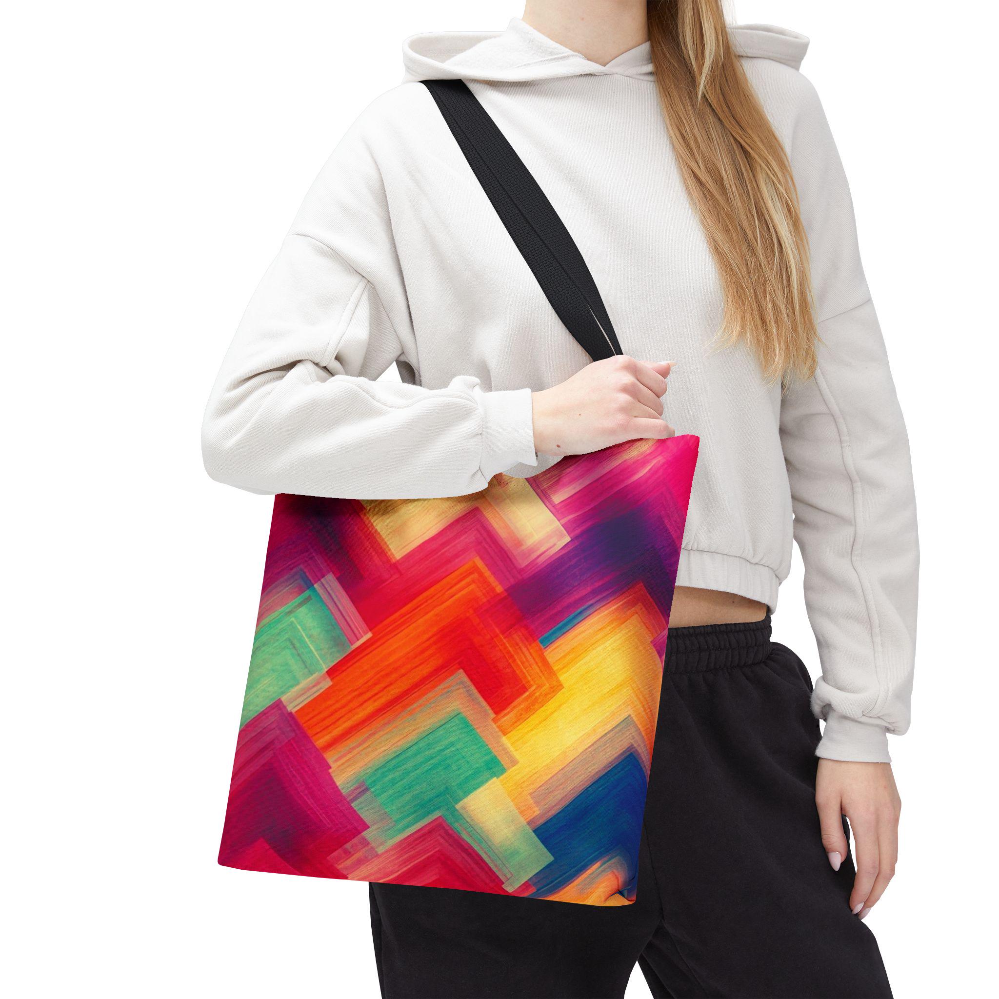 Bright, painterly strokes collide into a lively chevron pattern on this roomy tote — a little canvas of color you can carry everywhere. The medium-weight polyester holds its shape while the boxed corners give extra room for groceries, sketchbooks, or a market haul. Black cotton handles and reinforced stitching stand up to daily wear, and the smooth non-woven laminate interior keeps things tidy. It feels energetic and personal: the kind of bag you grab when you want your accessories to reflect a sunny, creative mood.