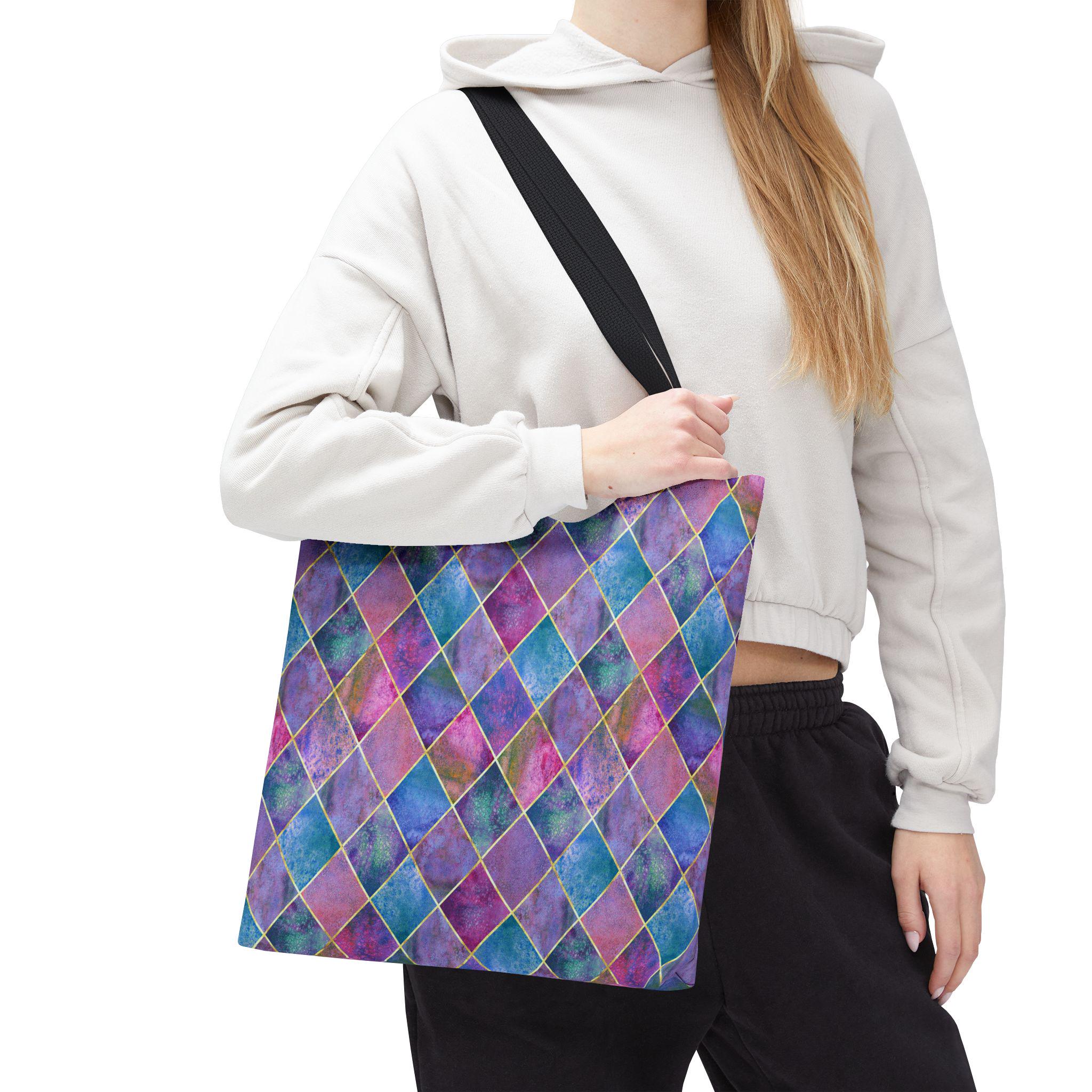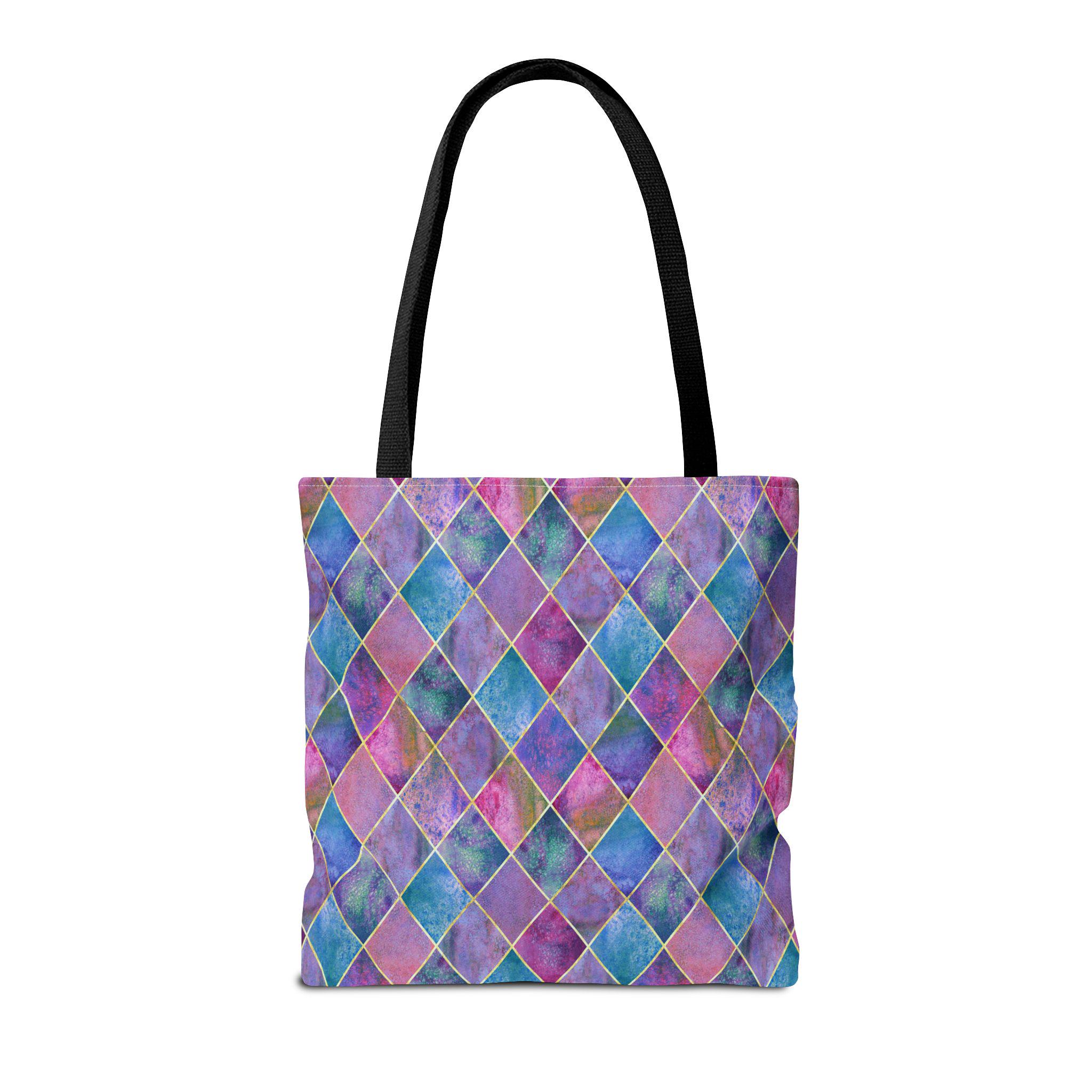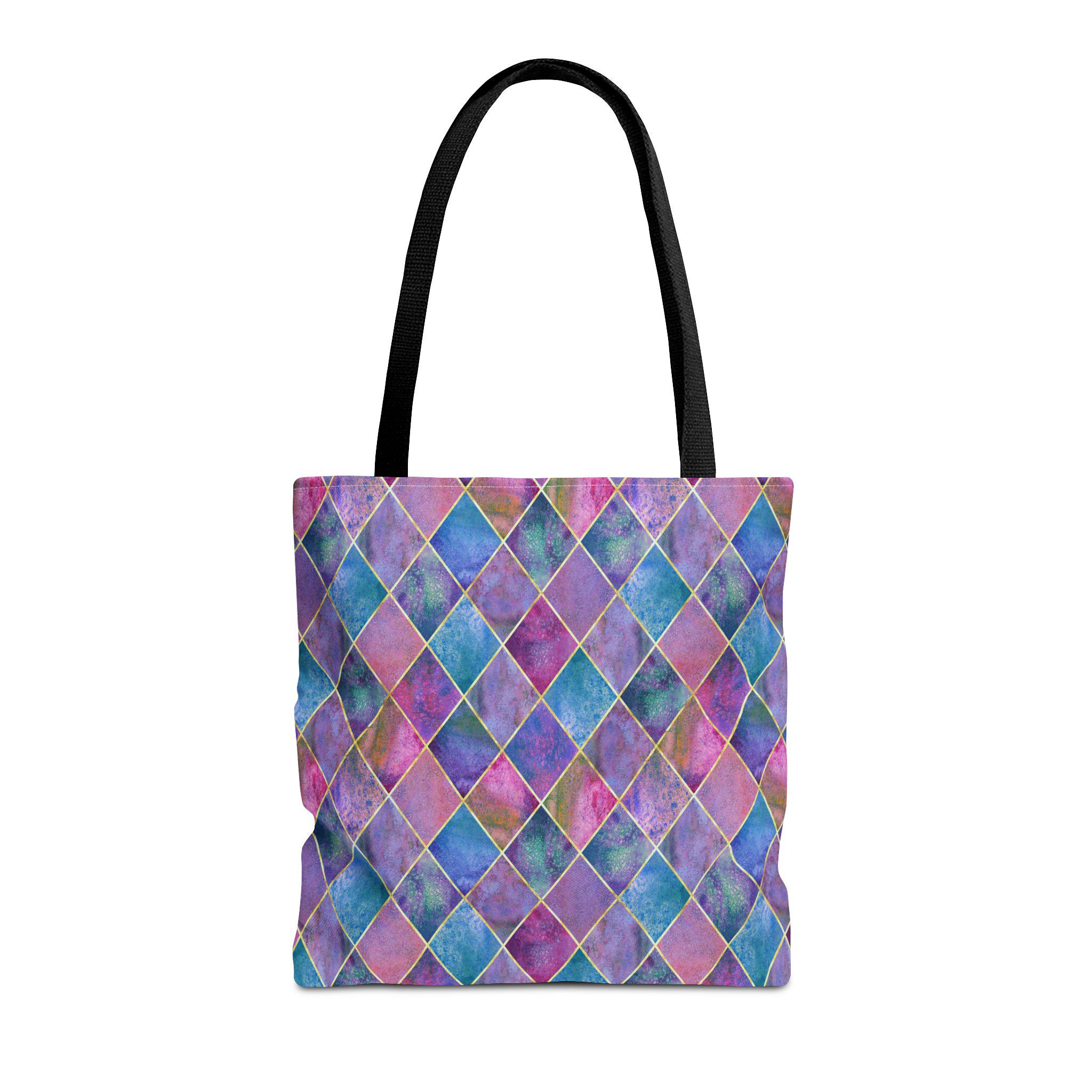 A vibrant, artful tote that carries color like a tiny, portable canvas. Handled in black cotton for contrast, the bag’s diamond harlequin pattern blends watercolor blues, purples, and pinks with soft gold accents — a look that feels both whimsical and sophisticated. The roomy boxed-corner shape opens flat to hold groceries, sketchbooks, or a weekend market haul. The sturdy polyester body keeps the print vivid and resists stretching and moisture, while reinforced handle stitching and a laminated interior mean this tote handles daily life without fuss. Bring it to art walks, café work sessions, or errands when you want your bag to be an outfit statement as much as a practical companion.