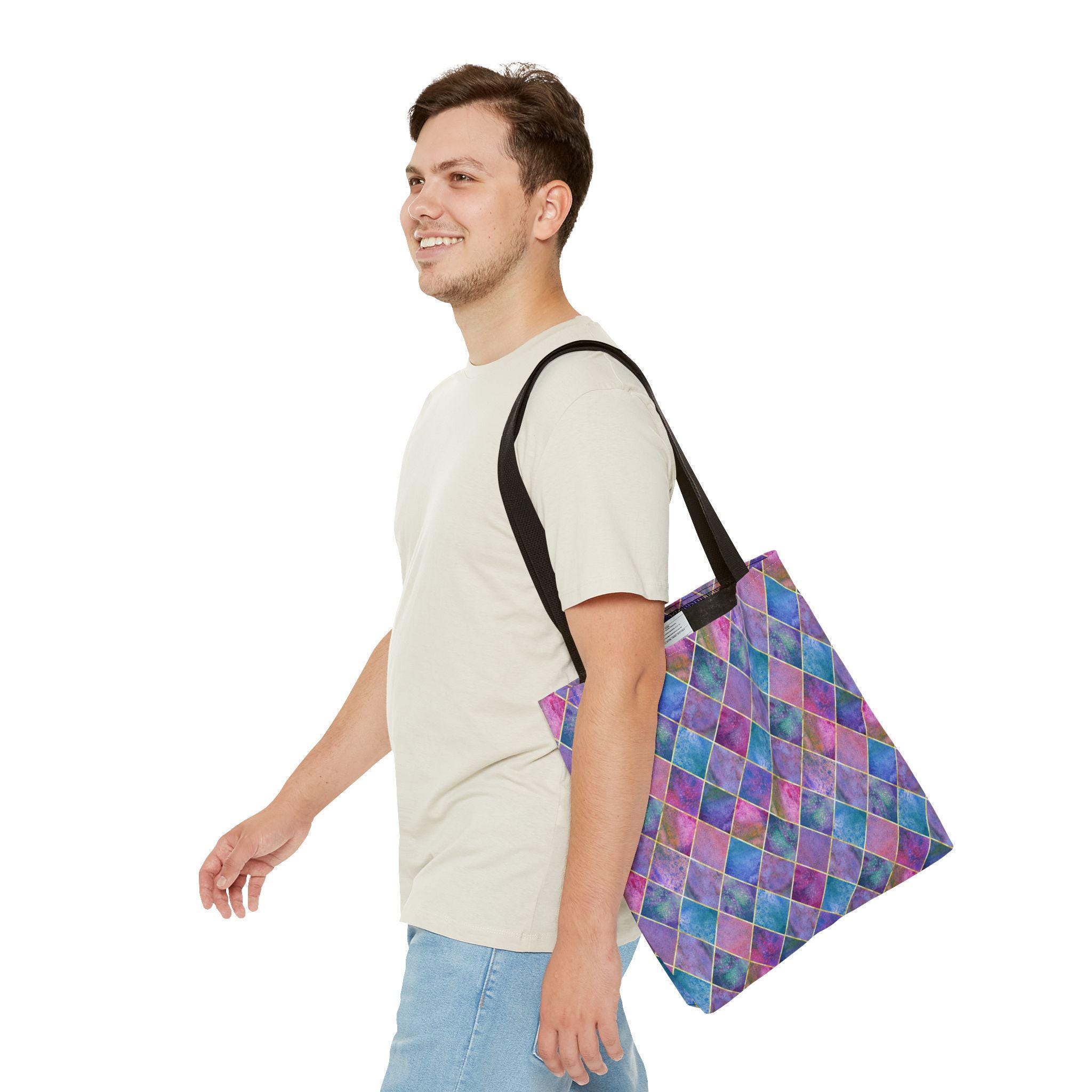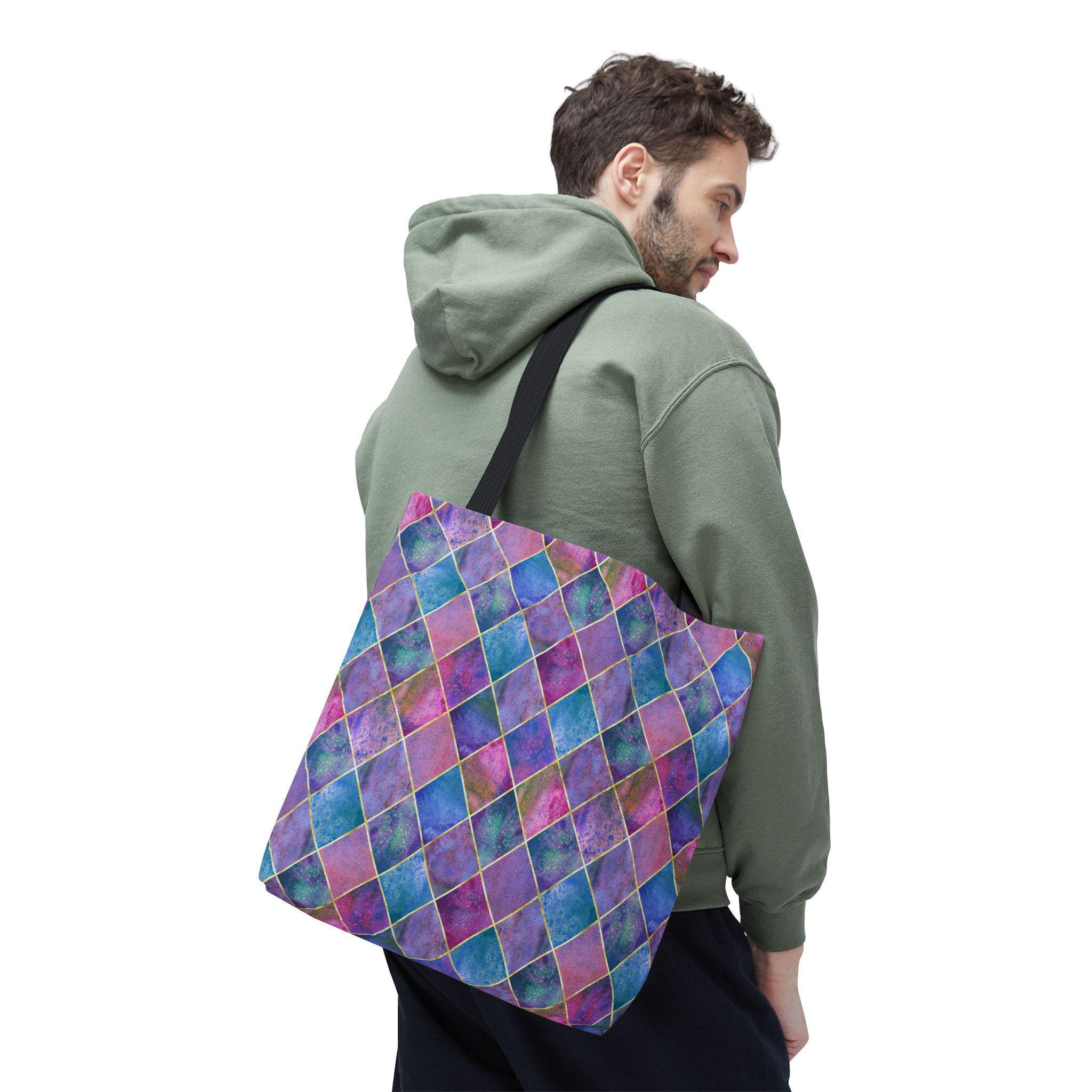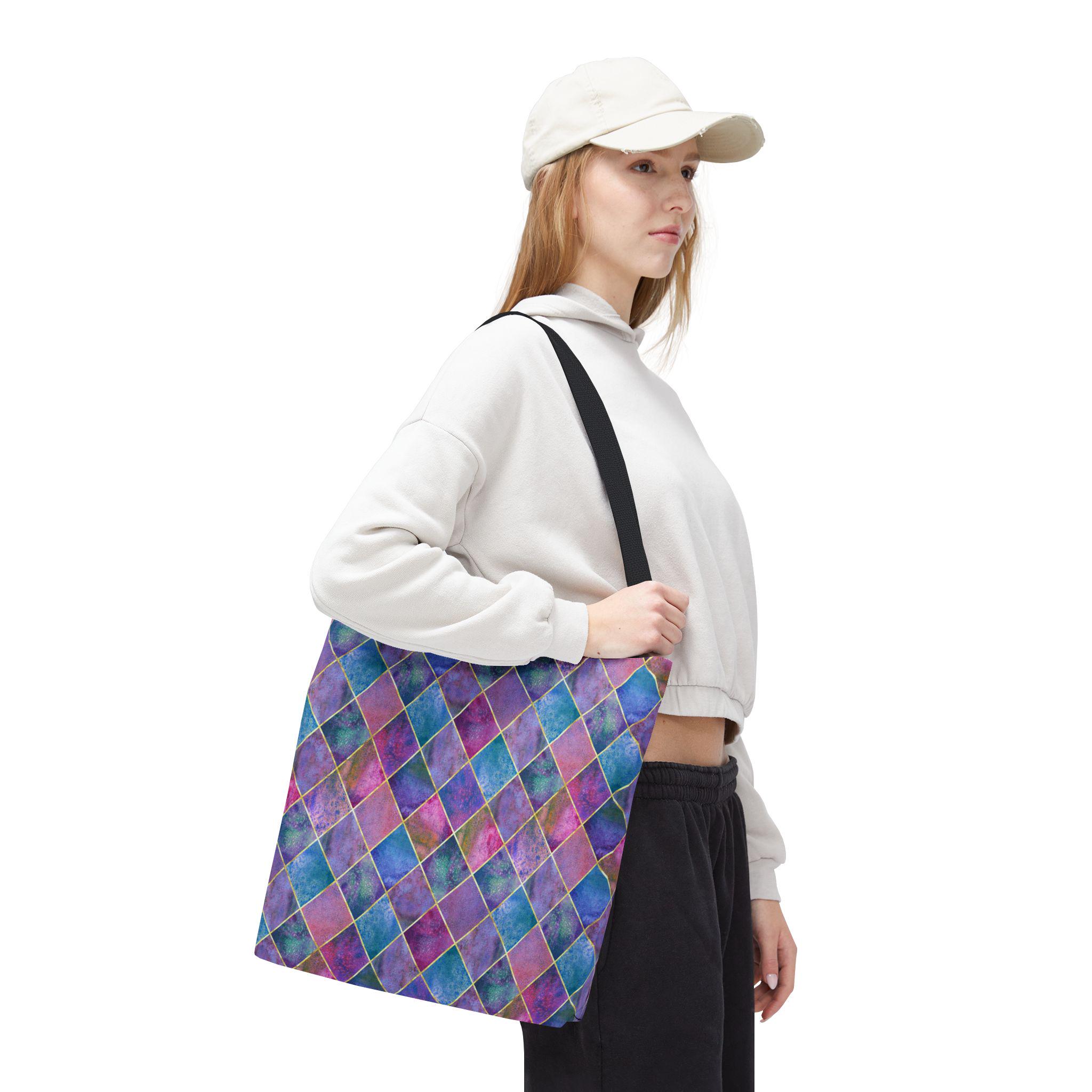 A vibrant, artful tote that carries color like a tiny, portable canvas. Handled in black cotton for contrast, the bag’s diamond harlequin pattern blends watercolor blues, purples, and pinks with soft gold accents — a look that feels both whimsical and sophisticated. The roomy boxed-corner shape opens flat to hold groceries, sketchbooks, or a weekend market haul. The sturdy polyester body keeps the print vivid and resists stretching and moisture, while reinforced handle stitching and a laminated interior mean this tote handles daily life without fuss. Bring it to art walks, café work sessions, or errands when you want your bag to be an outfit statement as much as a practical companion.