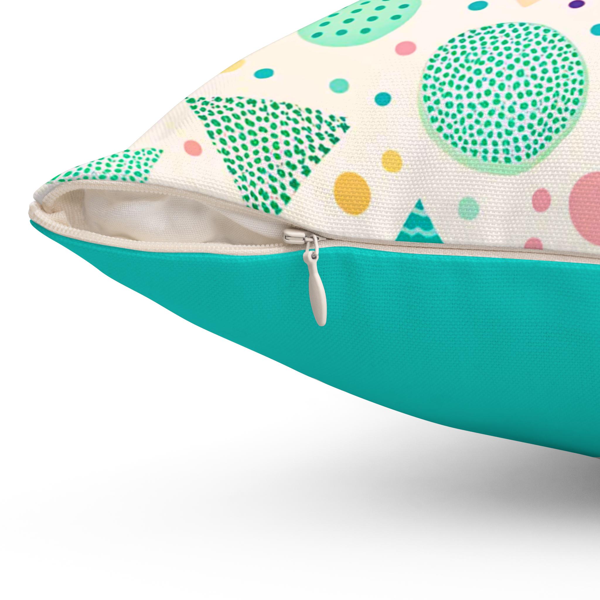 Bright, playful, and full of retro charm — this square pillow brings a lively pop of color to any room. The double-sided print shows a fun mix of pastel shapes and squiggles on a soft cream background, while the reverse offers a calming teal that balances the pattern. It feels light and cheerful on a sofa, lends a splash of whimsy to a child’s reading nook, and layers easily with textured throws for a modern, nostalgic vibe. This pillow is for those who love lively patterns, soft pastels, and interiors that smile back at you.