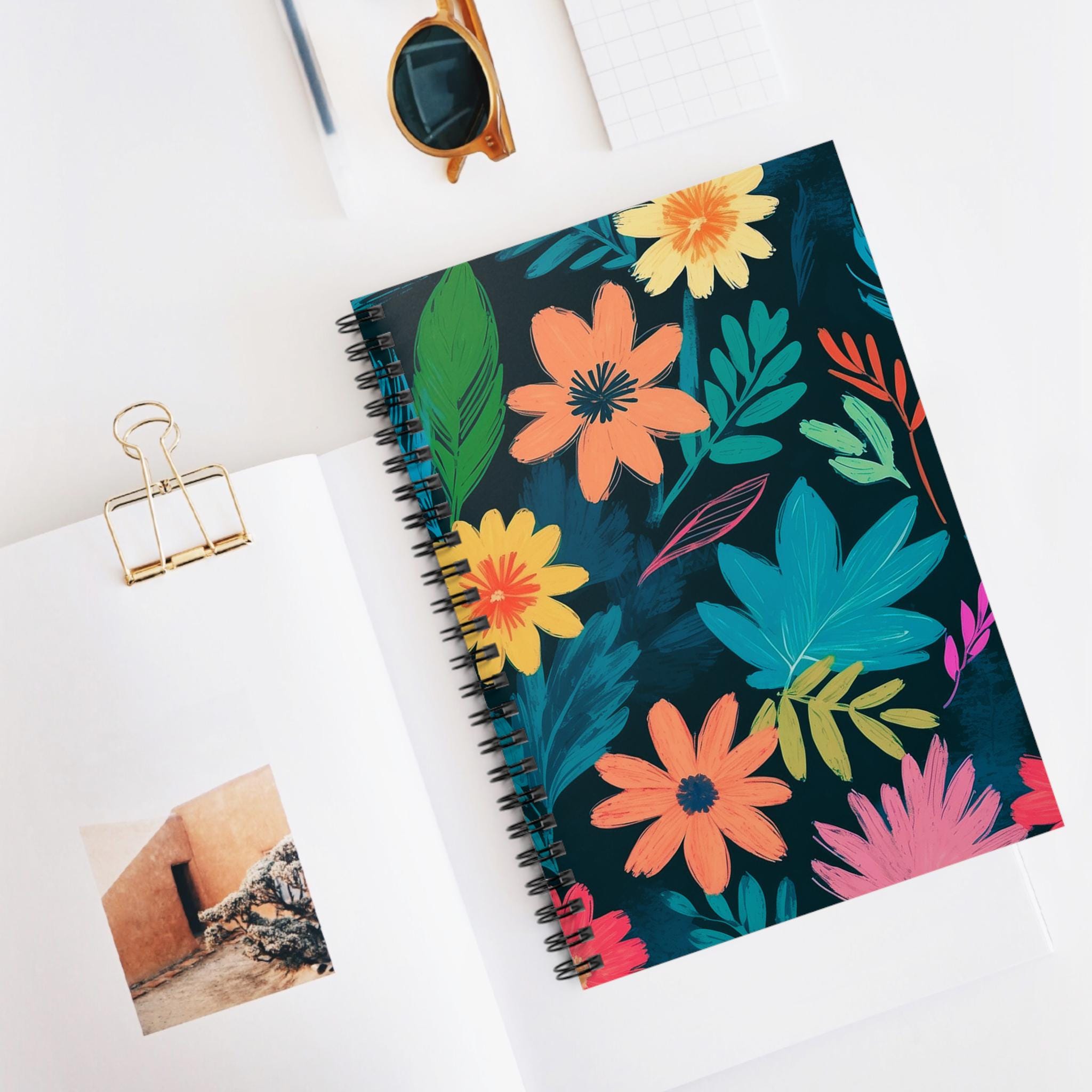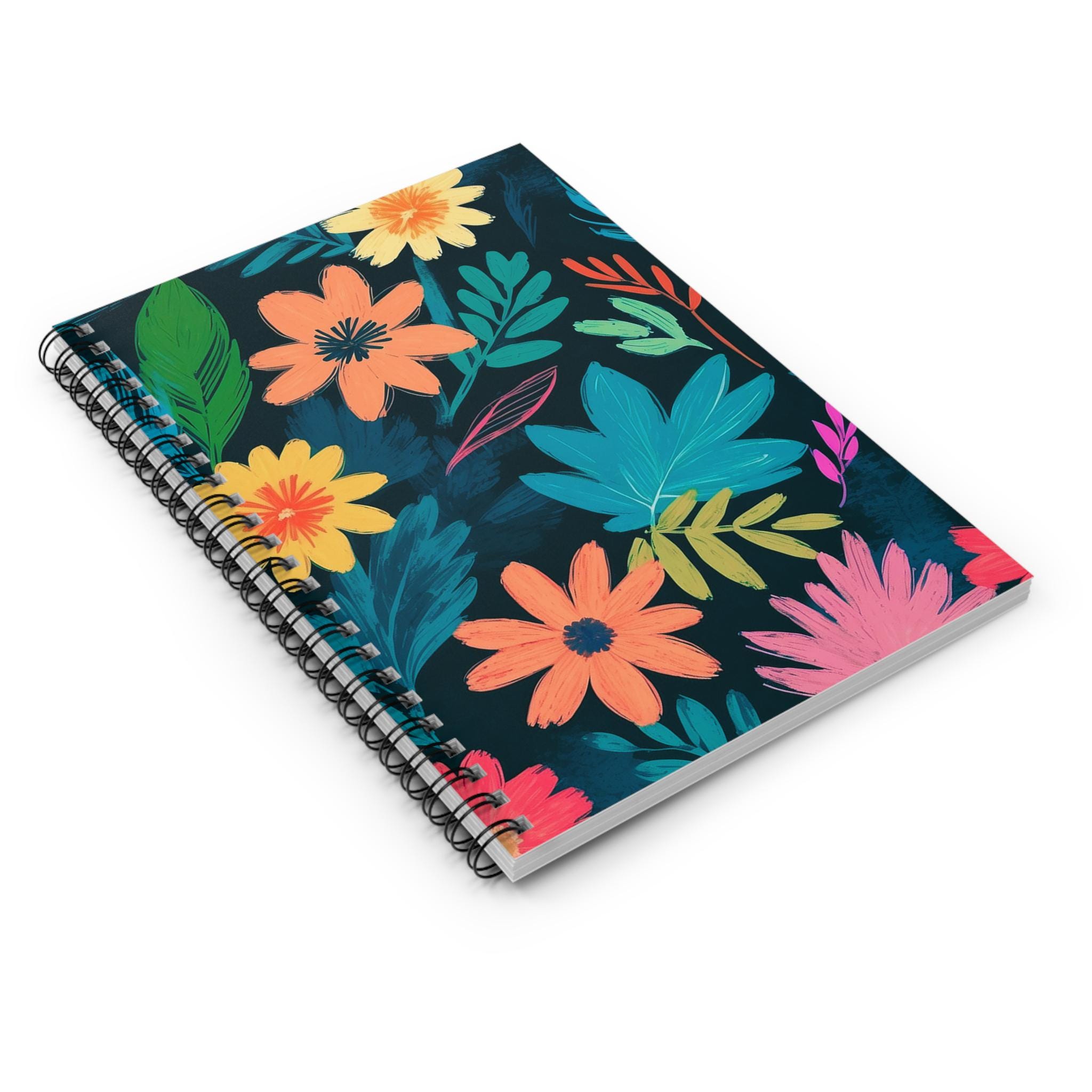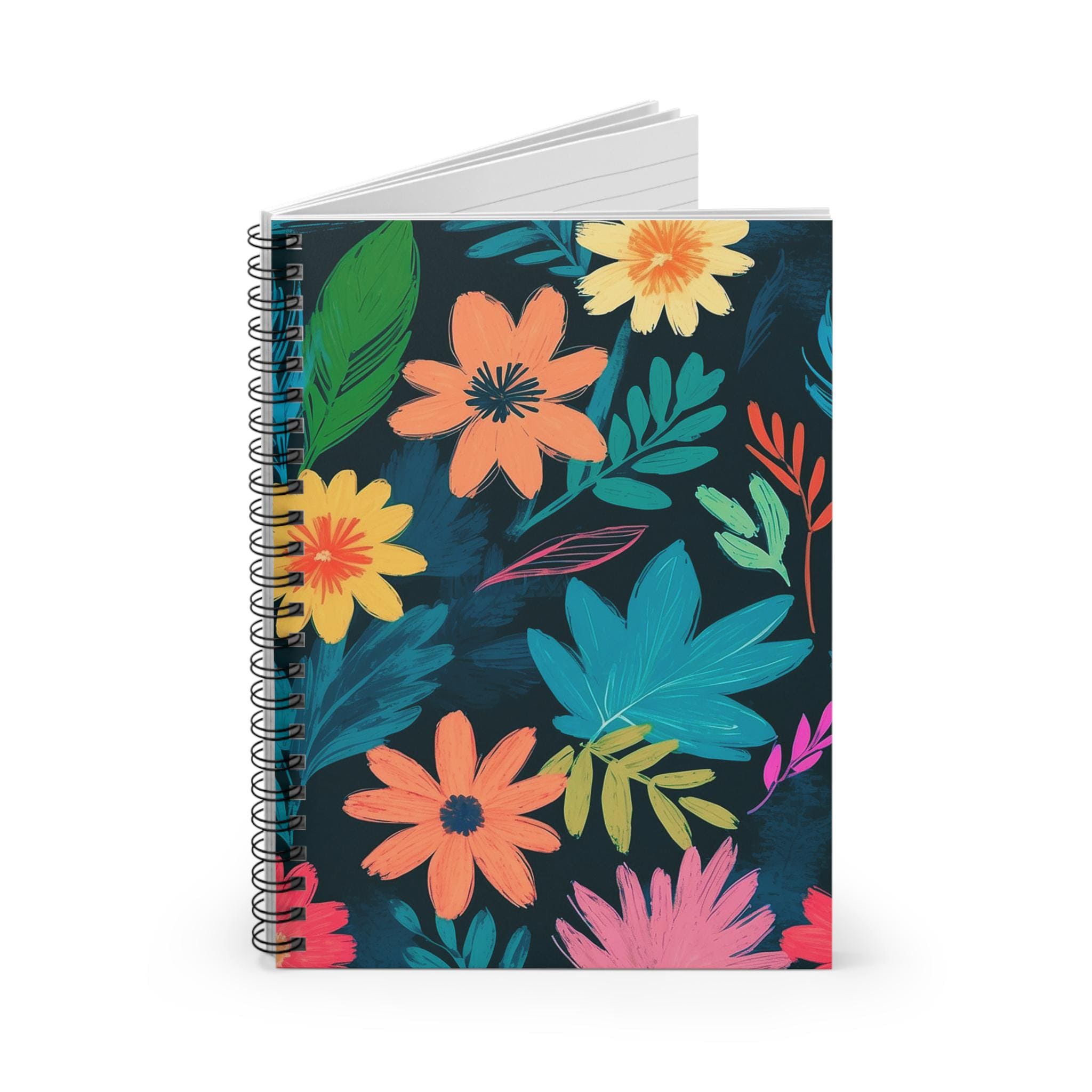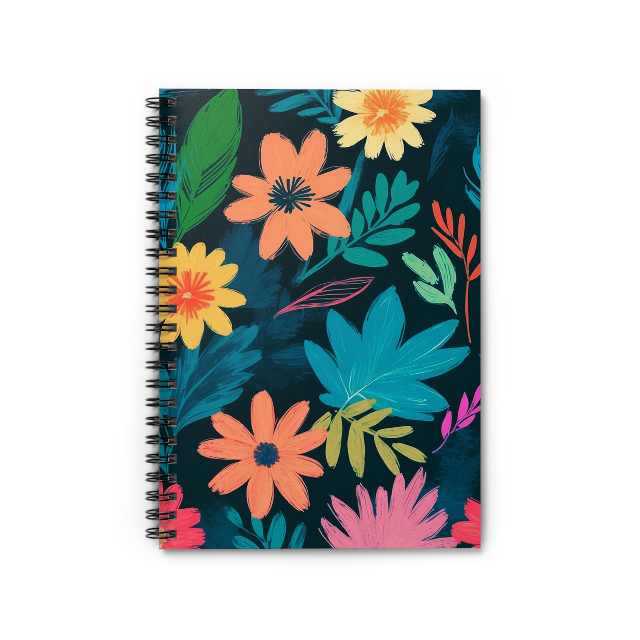 This spiral notebook brings a burst of hand-painted florals to your everyday writing. The dark, moody background makes each vibrant blossom pop — like a secret garden tucked into your bag. It’s narrow and light enough to carry between classes or meetings, yet substantial with 118 ruled pages for lists, notes, and long-form thoughts. The metal spiral lets the notebook lie flat or fold back for one-handed writing. A built-in document pocket keeps loose tickets, receipts, or ephemera safe. Use it for journaling on rainy mornings, sketching color palettes, or keeping studio ideas organized; the cheerful cover invites you to open it again and again.
