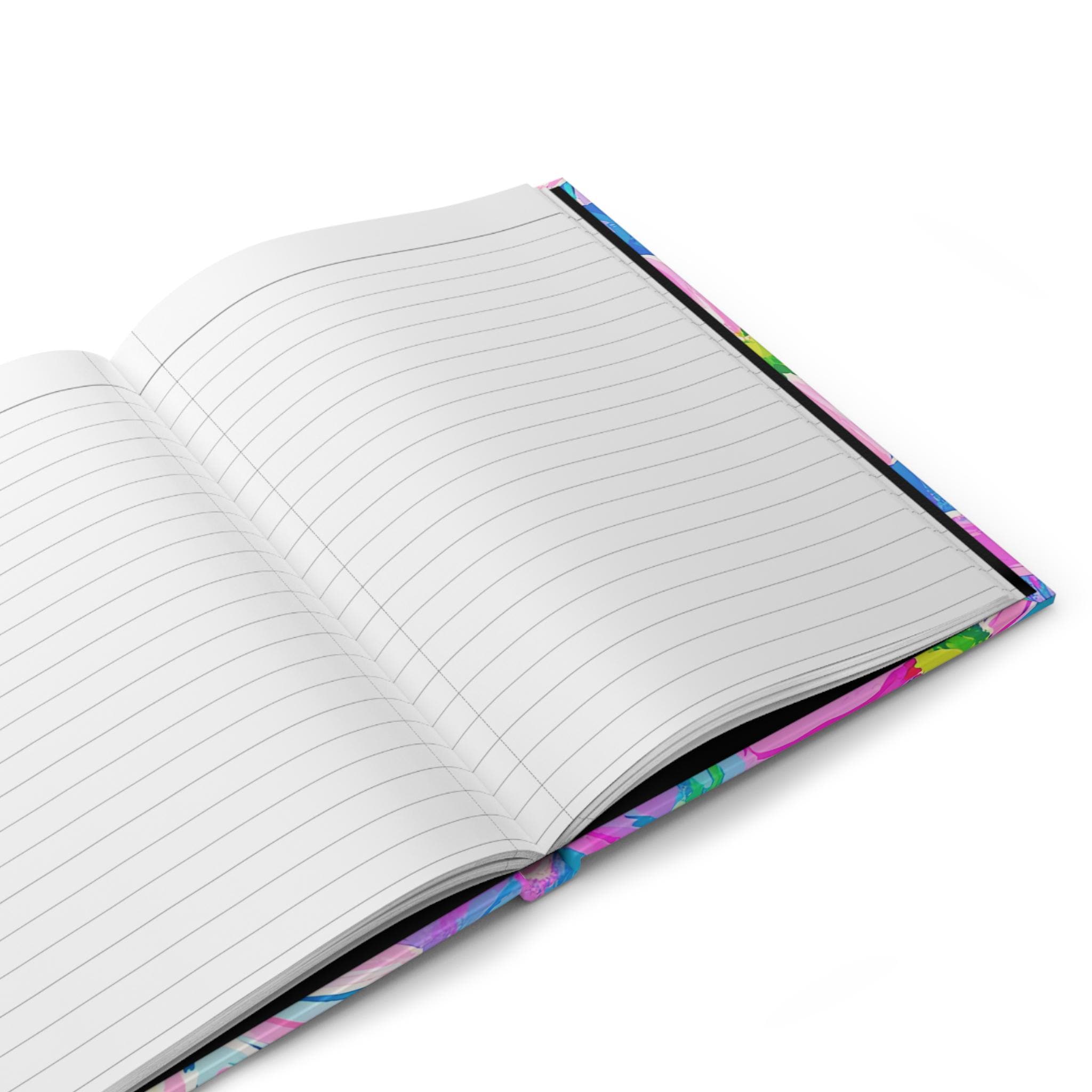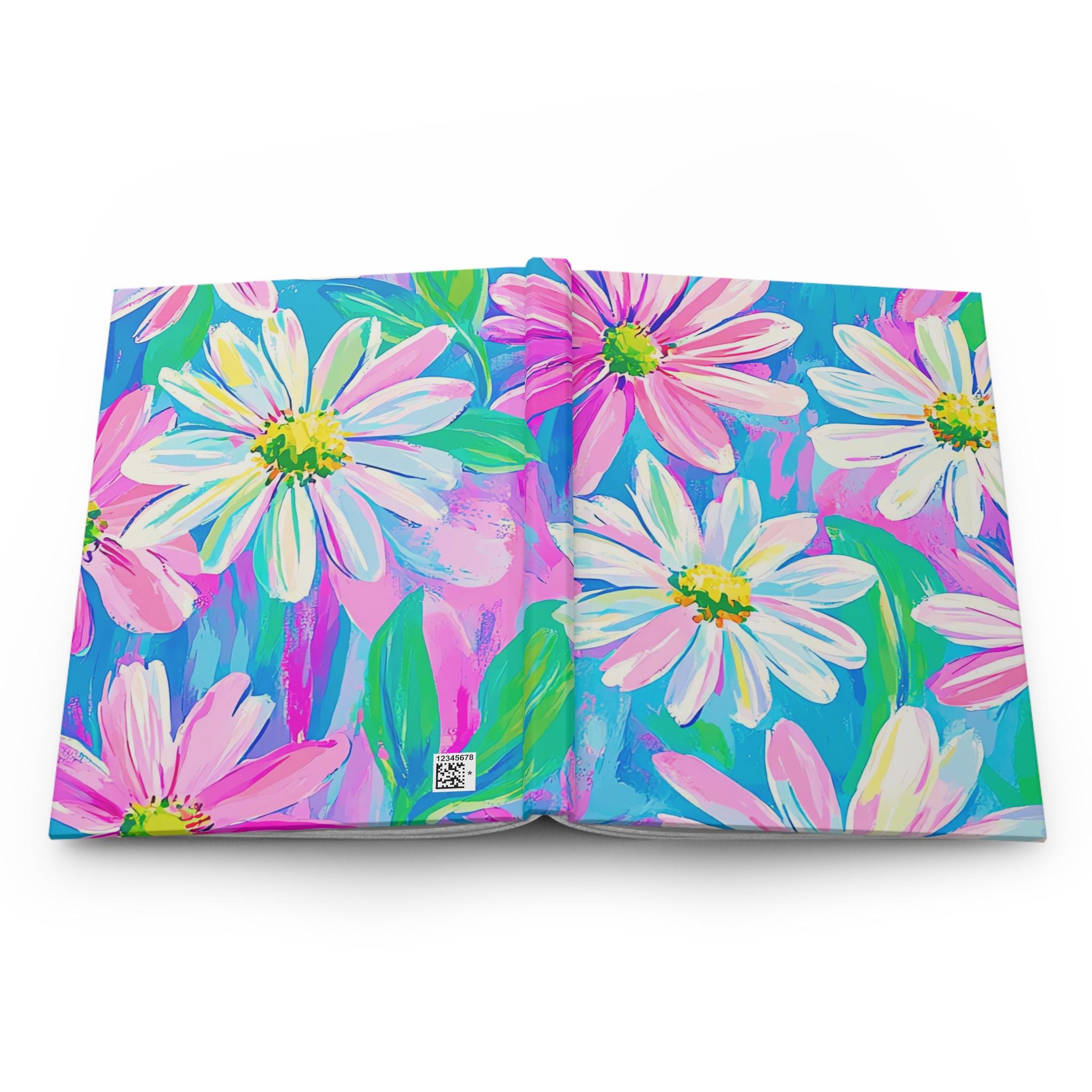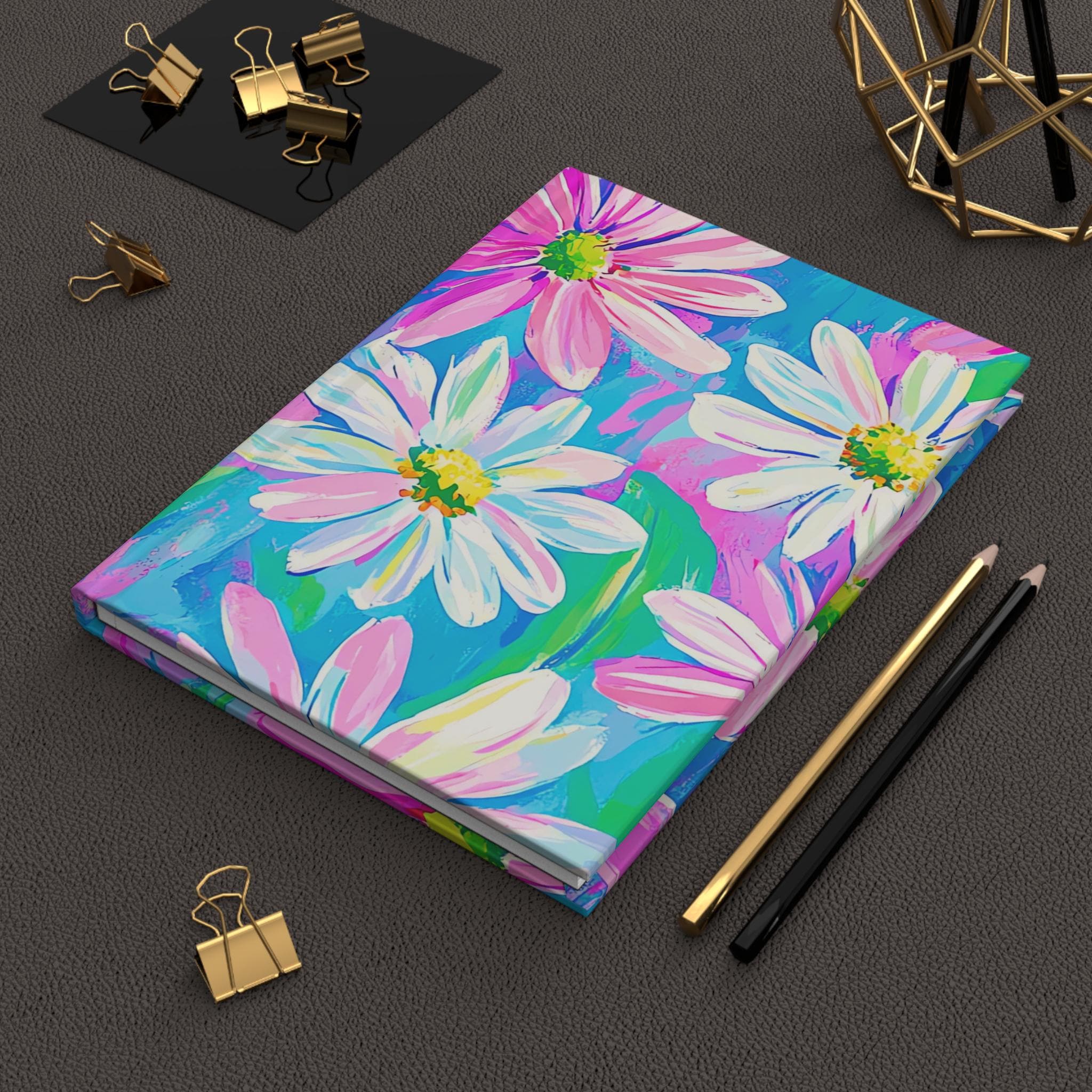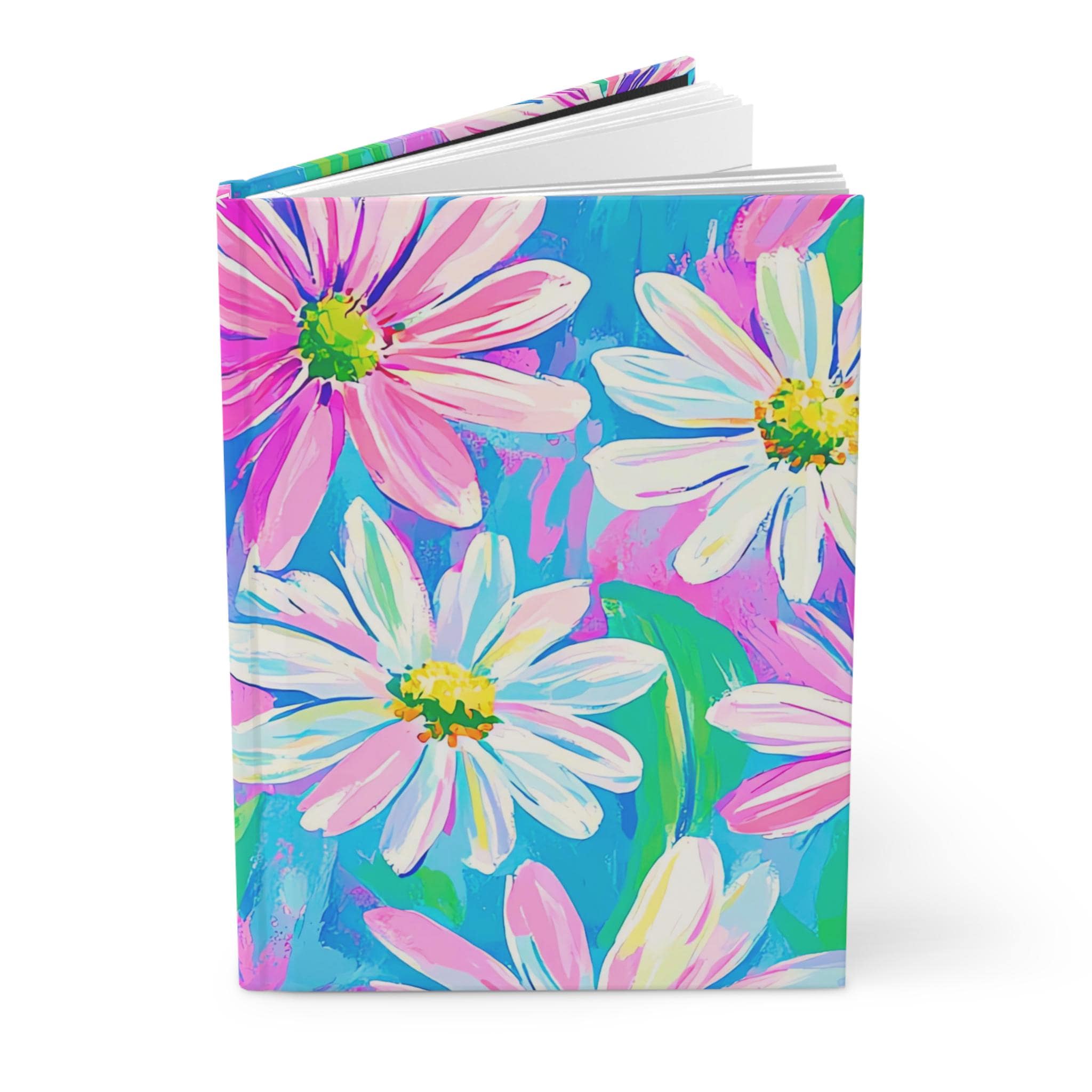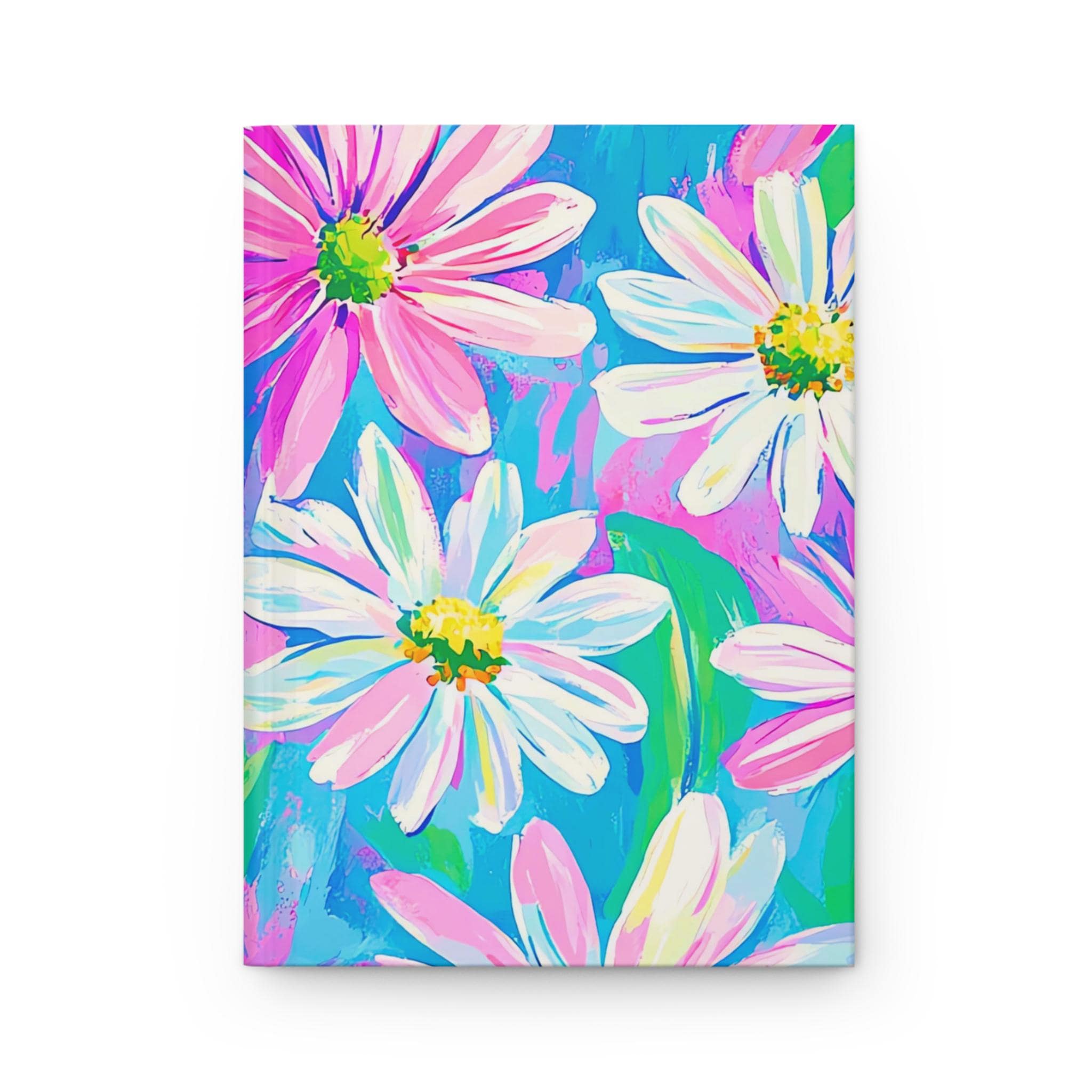 This hardcover journal invites bright, joyful moments onto its pages. The matte laminated cover features painterly daisies in energetic strokes of pink, turquoise, and lime — a lively scene that encourages daily notes, sketching, or lists. The sewn case wrap binding lets the book open comfortably and lie flat while the 150 lined pages and perforated sheets give you structure and the option to tear out pages neatly. Lightweight and durable, the full-wrap print keeps the floral art continuous around the cover, so every glance feels like a little burst of color in your day.