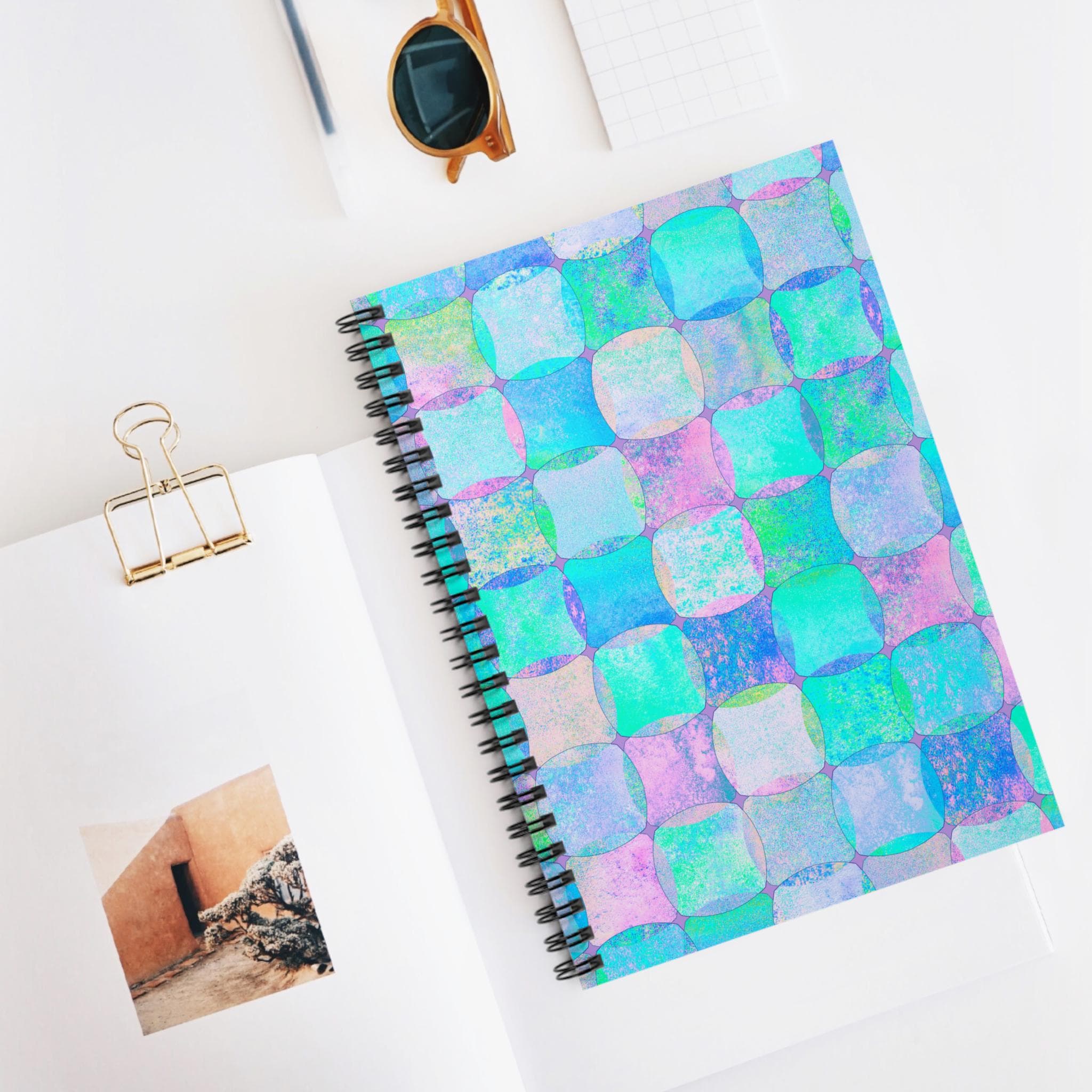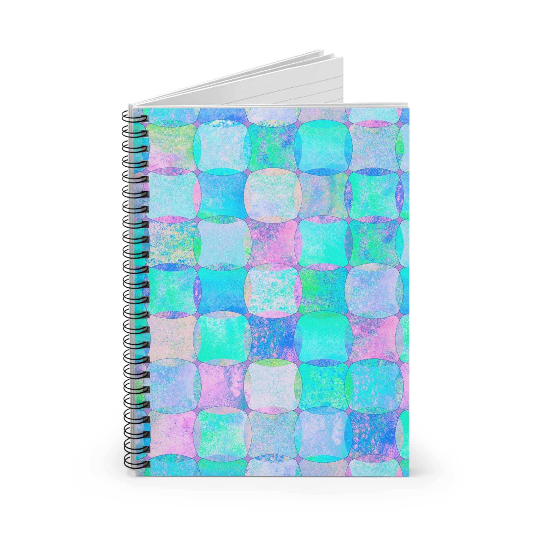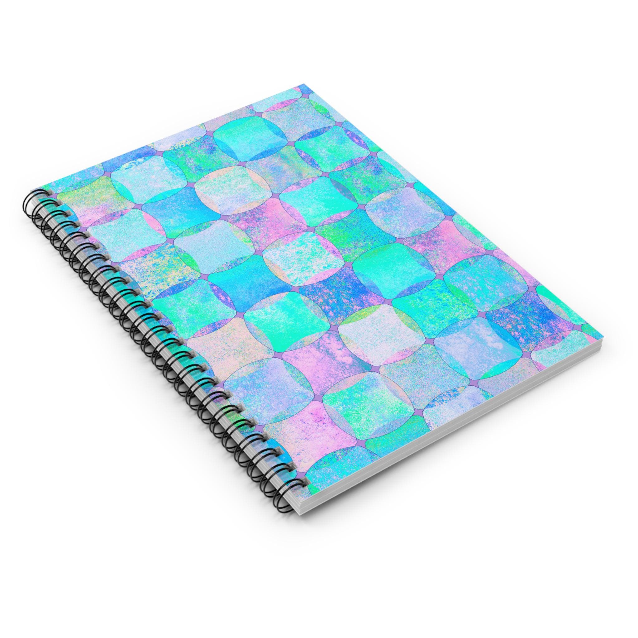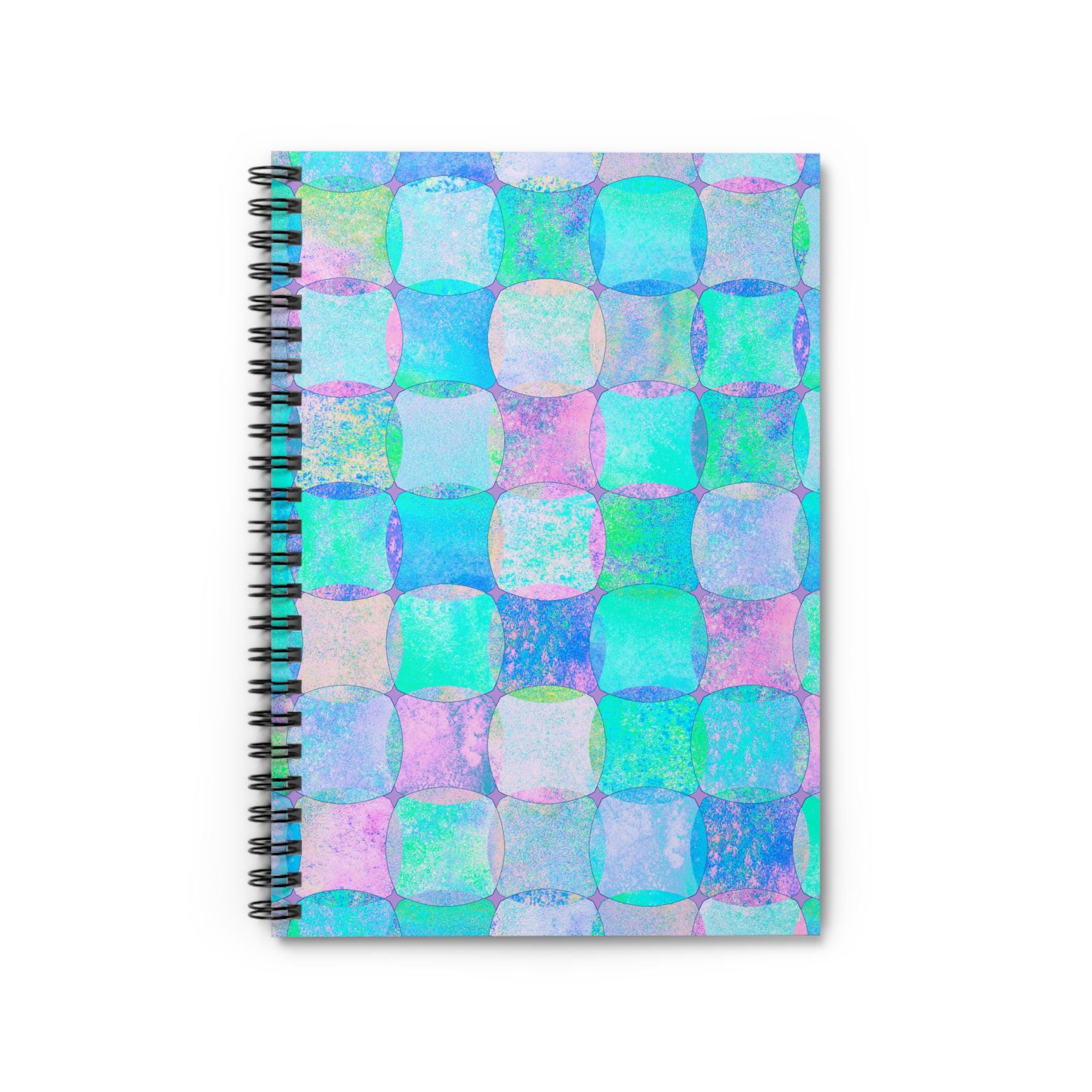 This spiral notebook brings a soft, dreamy energy to everyday notes. The cover’s hand-painted checker squares blend teal, aqua, lavender, and pastel pink into a watercolor mosaic that feels like a quiet tide or an artist’s daydream. At 6 x 8 inches it slips easily into a tote or backpack, ready for to-do lists, sketches, meeting notes, or morning pages. The sturdy 350 gsm covers protect 118 ruled pages of 90 gsm paper that take pen strokes smoothly without feeling flimsy. A metal spiral lays flat for comfortable writing and makes tearing out pages clean and simple. An inside document pocket keeps loose receipts, sketches, or stickers organized. This notebook lives where creativity and everyday planning meet — for the person who likes a little color in routine moments.