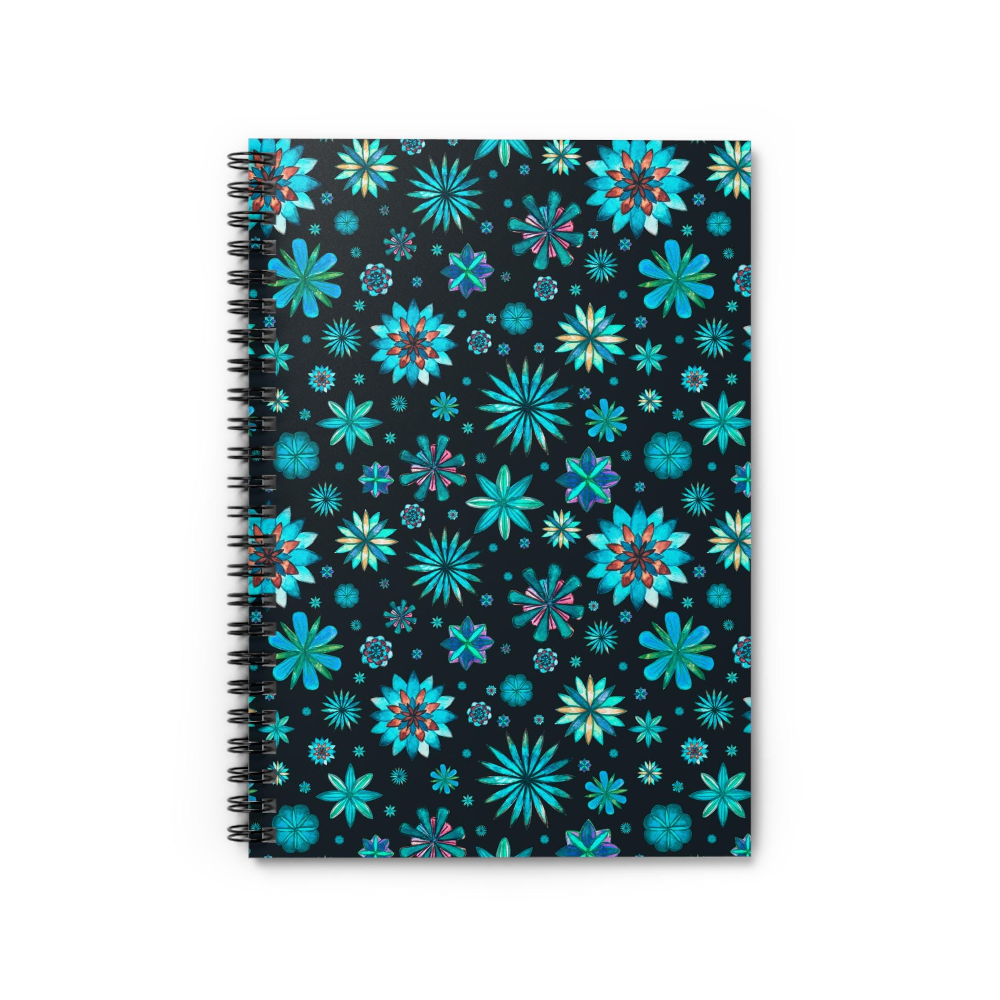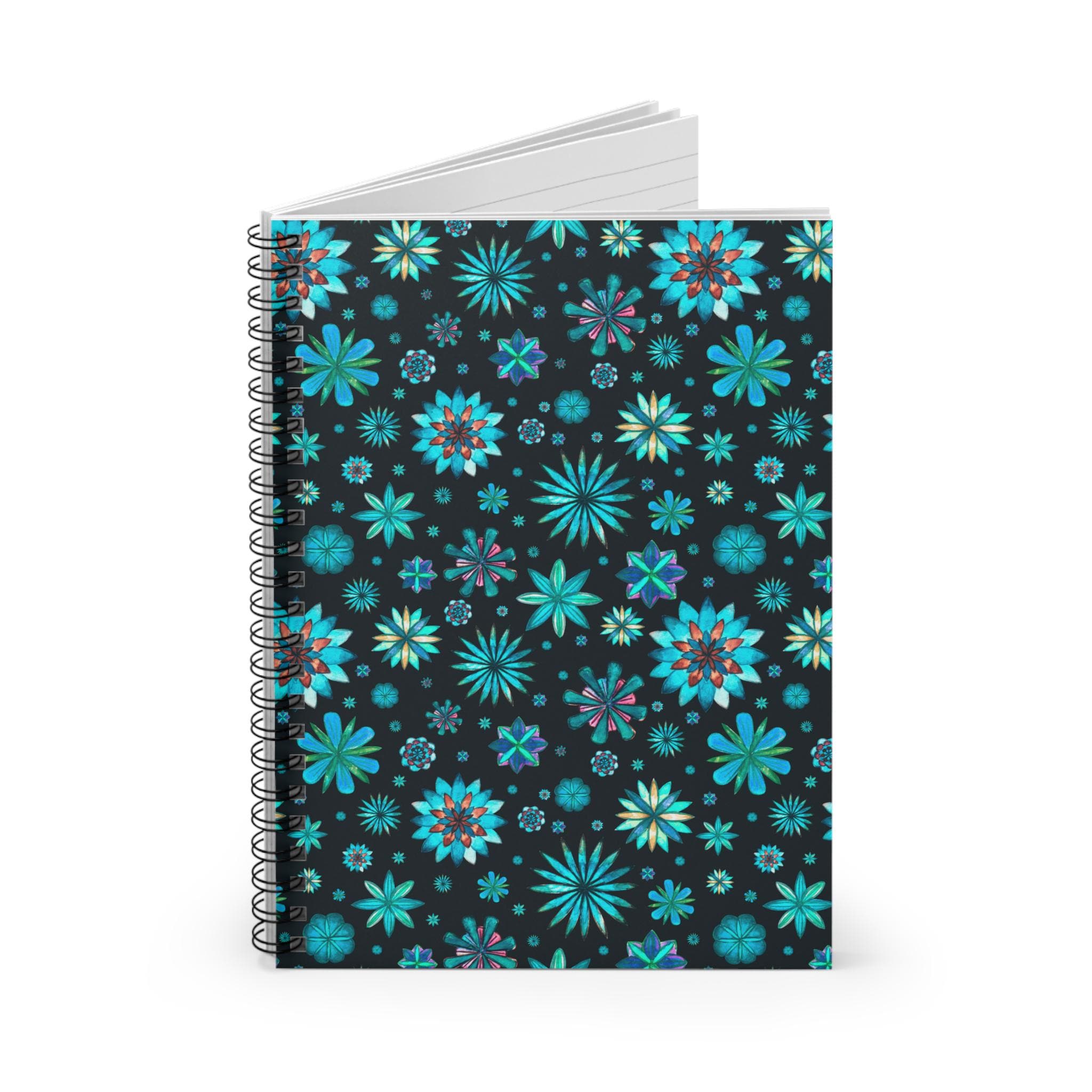 A compact spiral notebook that brings calm and color to everyday notes. The deep charcoal cover is peppered with meditative teal and aqua floral motifs that feel like tiny galaxy blooms — quiet, focused, and a little bit joyful. Inside, smooth 90gsm ruled pages invite steady handwriting, whether you’re sketching plans, tracking ideas, or keeping a small daily log. A metal spiral lays flat for comfortable writing and lets you tear out pages cleanly. The inside back pocket holds receipts, stickers, or loose thoughts until you’re ready to file them away. Light and portable at 6" x 8", it slips into a bag or sits on a desk ready when inspiration strikes.