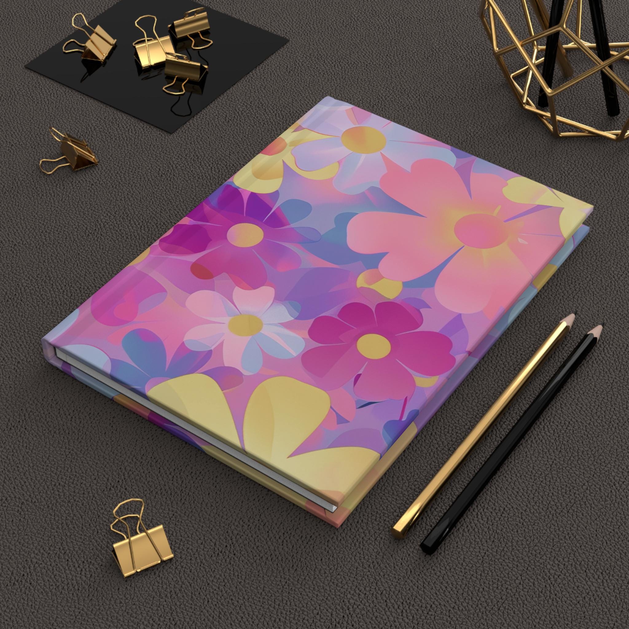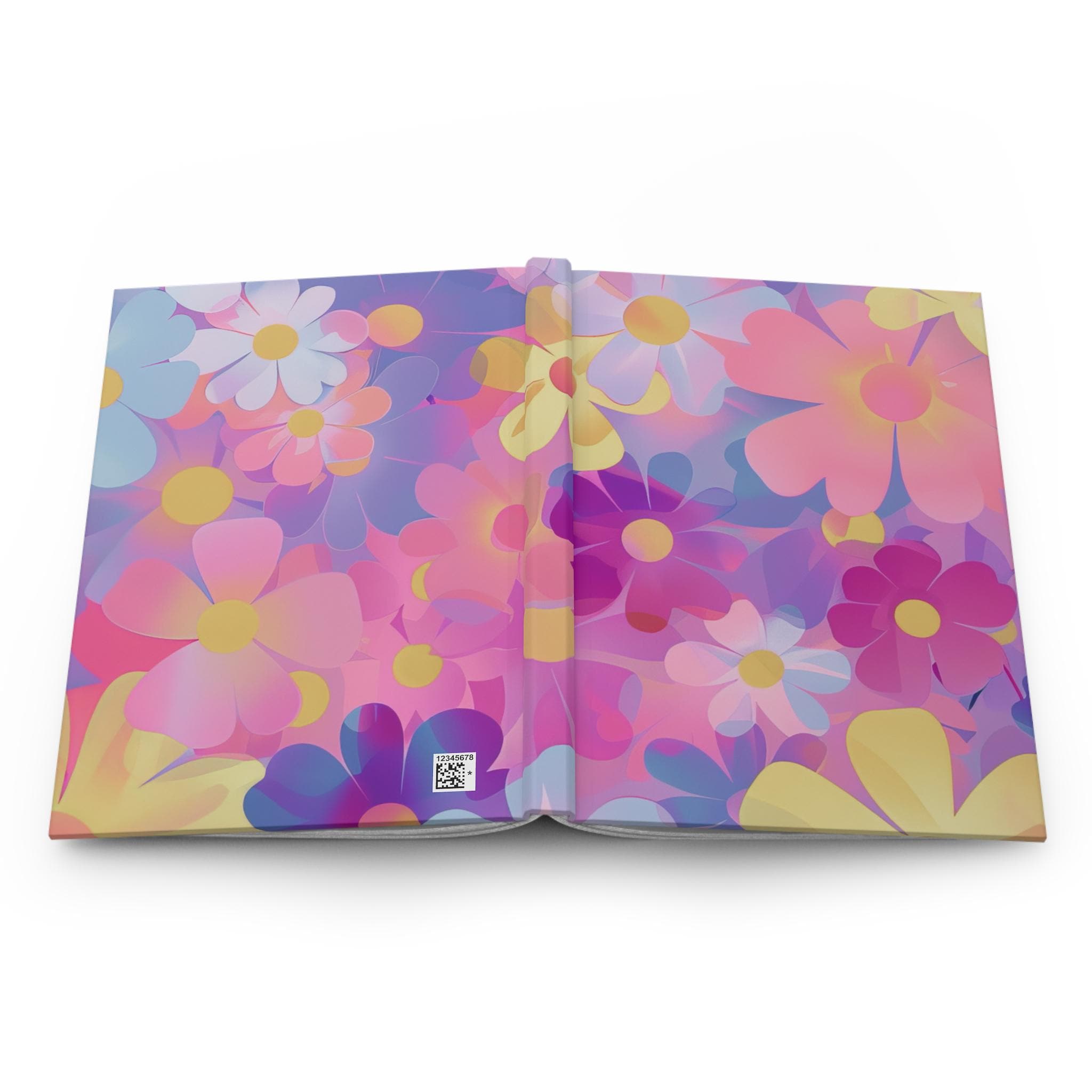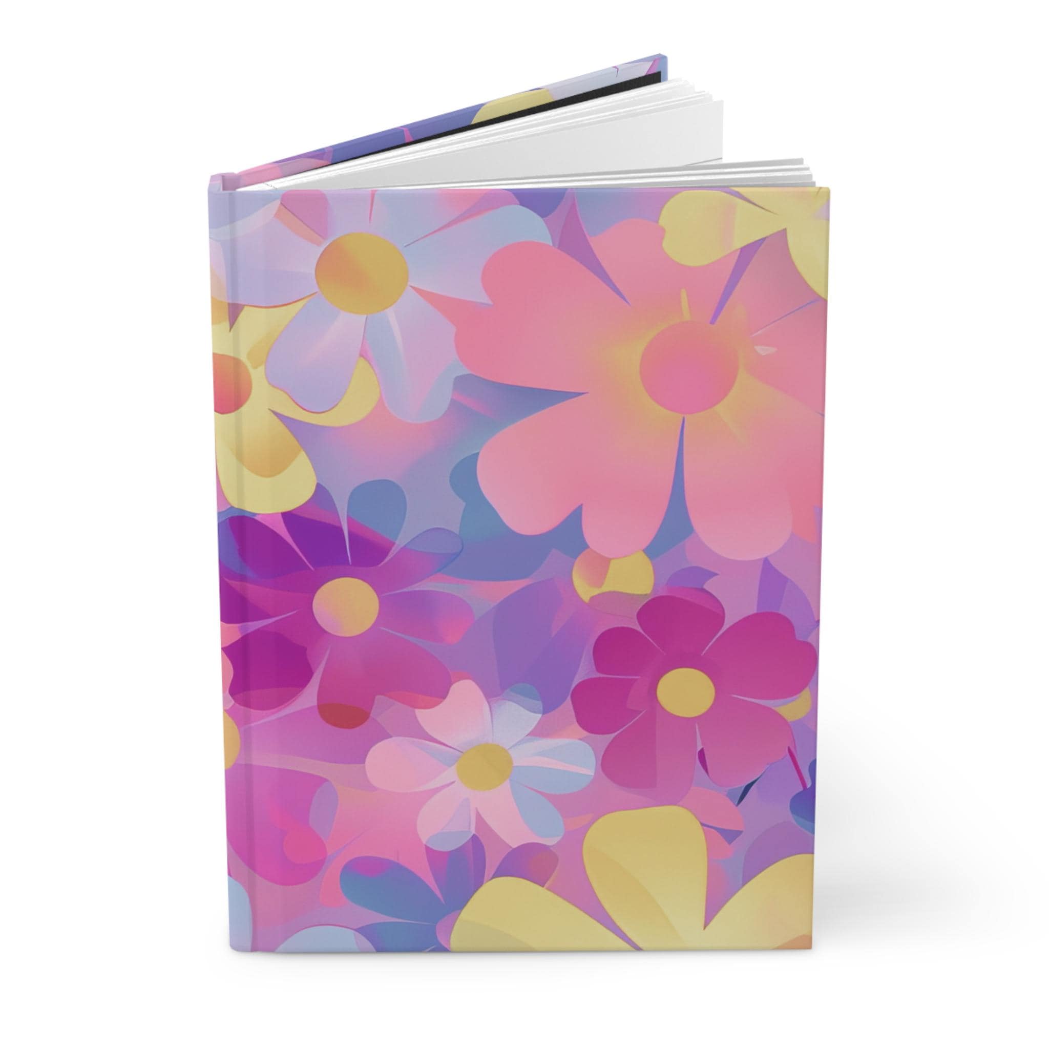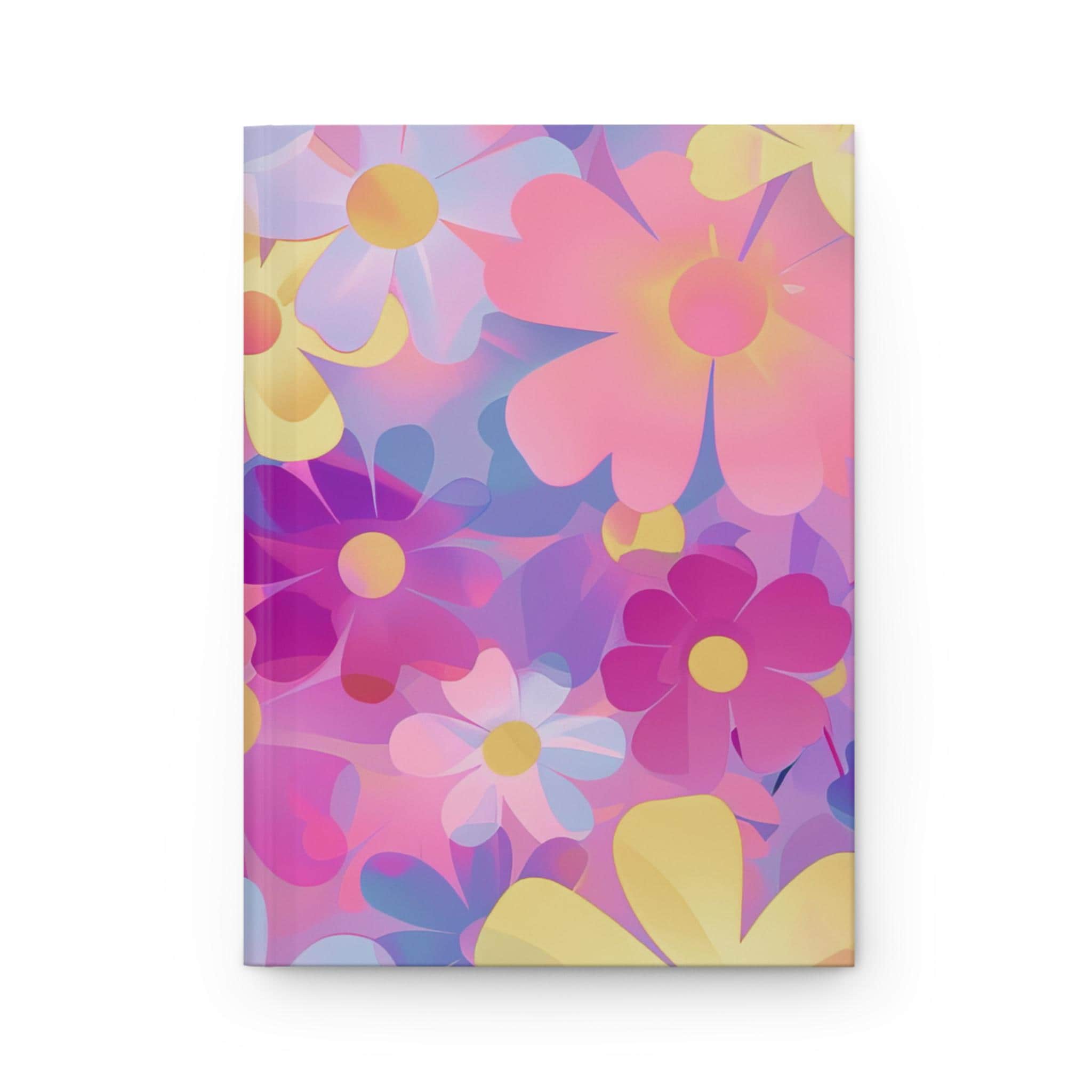 Bright, dreamy blooms cover this matte hardcover journal like a pocket of sunny nostalgia. The full-wrap artwork blends soft pinks, purples, and buttery yellows into layered floral shapes that feel both playful and gentle. It opens smoothly on a sewn spine, offering 150 lined pages with a perforated edge for easy removal. The matte laminated cover keeps colors vivid while resisting scuffs, so this journal travels well between coffee shop corners, studio desks, and backpack pockets. Use it for daily thoughts, sketching floral ideas, planning a weekend escape, or collecting lists and lyrics — the pages lie flat and welcome whatever you want to record.