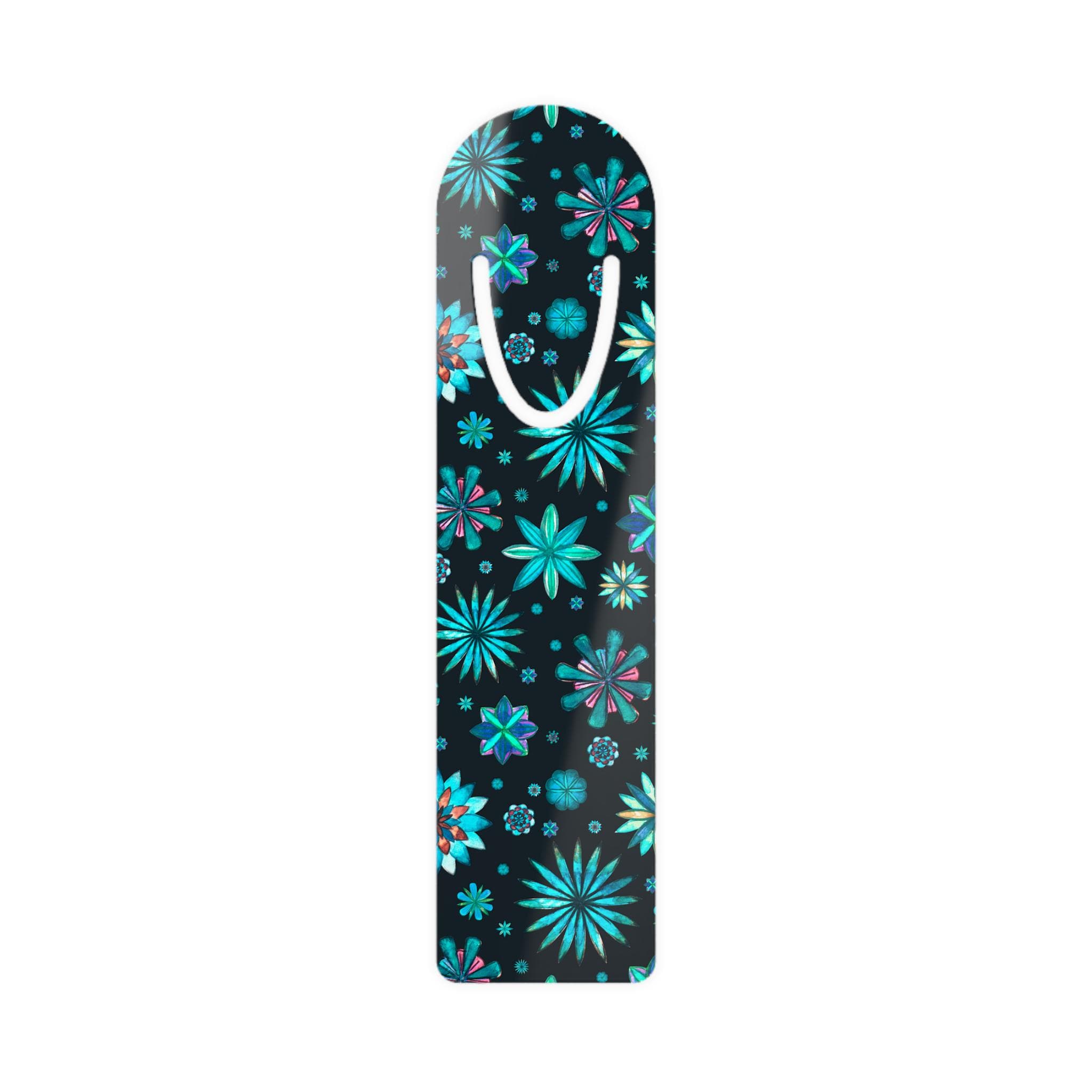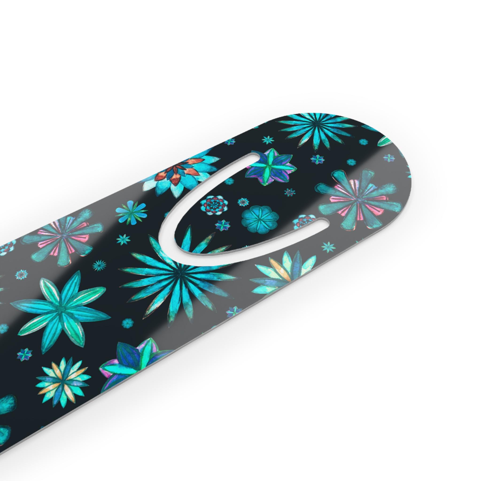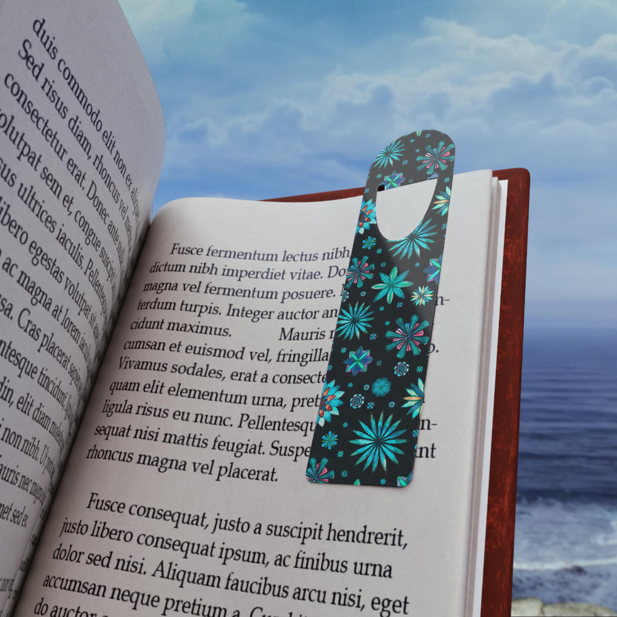 Slip into a quiet reading moment with this slender aluminum bookmark that feels made for slow pages and bright thoughts. The printed front carries a night-sky pattern of teal and aqua blooms that catch the eye without stealing the story. A rounded top and soft U-shaped slot cradle a page gently, while the lightweight aluminum body sits flat and unobtrusive between chapters. Keep it in a favorite paperback, tuck it into a travel journal, or let it ride along in a tote — it’s designed to be noticed when you reach for it, and forgotten while you read.