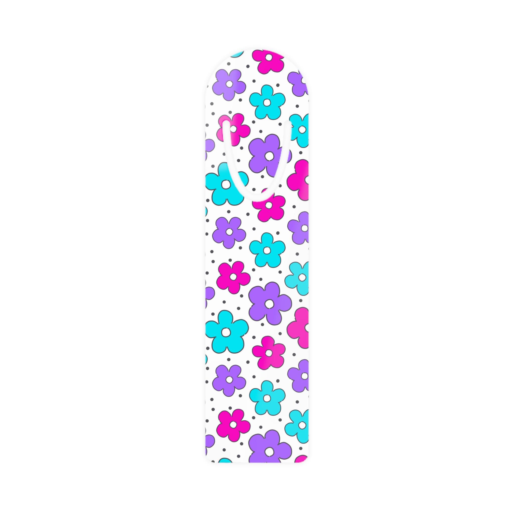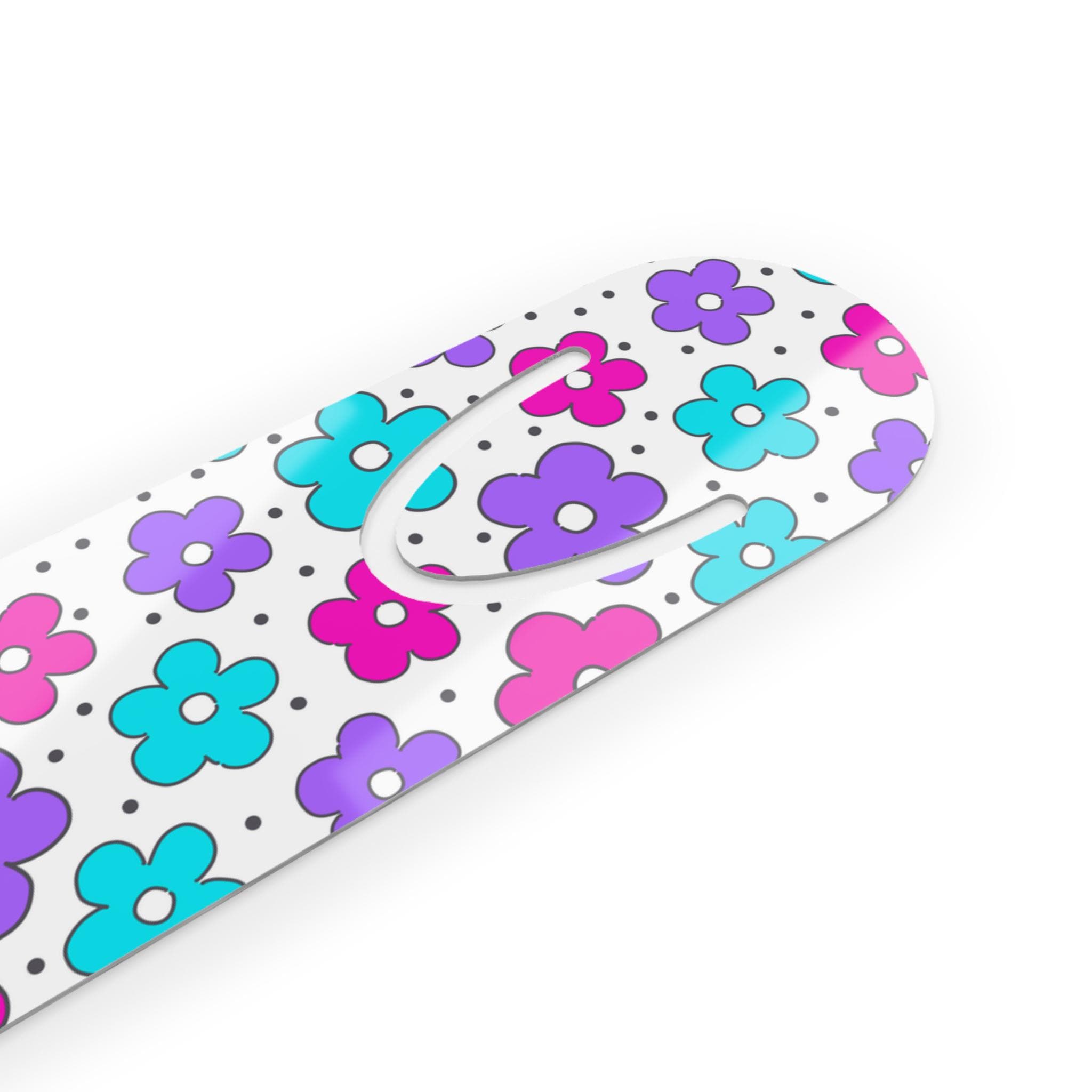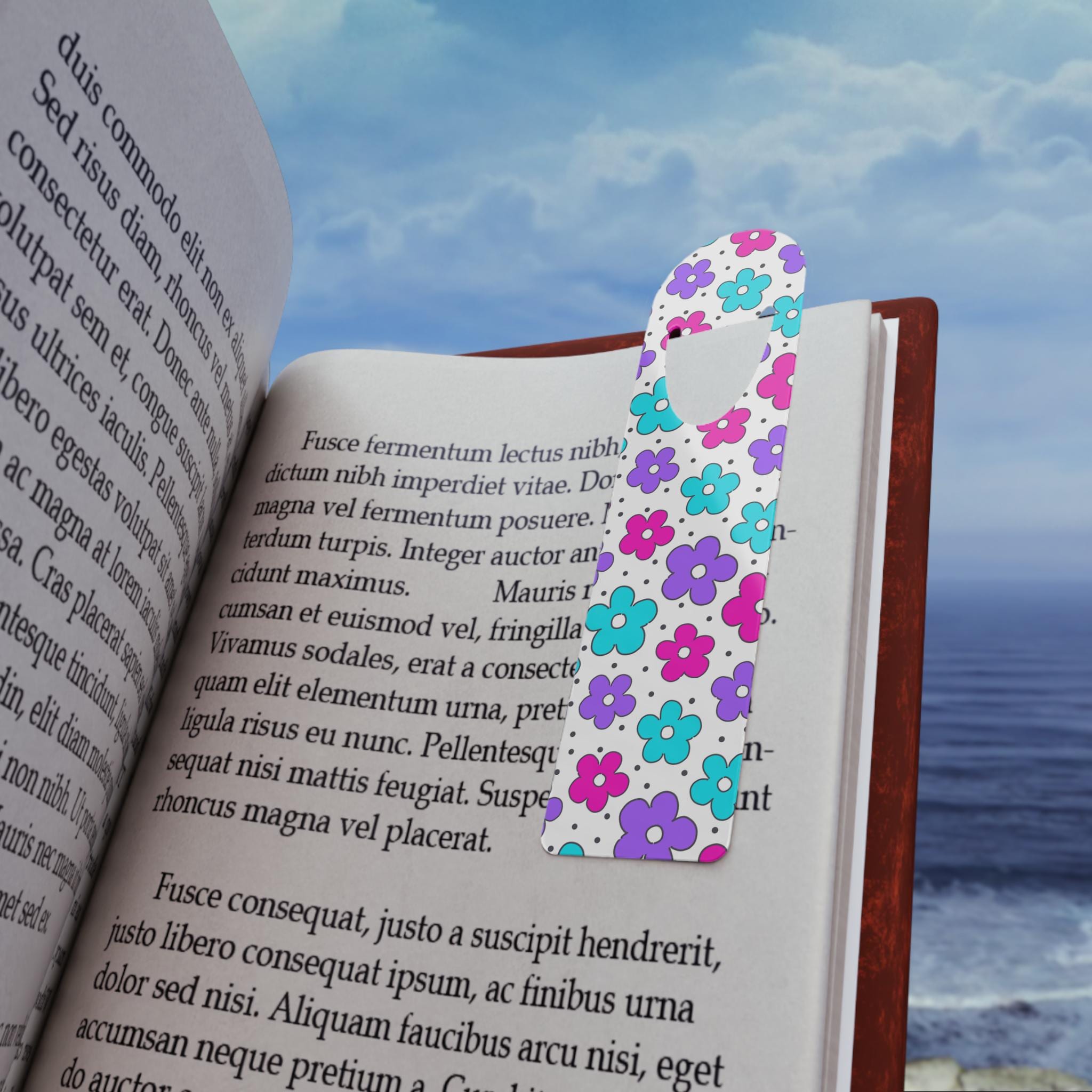 Slip this slim aluminum bookmark into your favorite paperback and feel a little burst of joy each time you open the cover. Lightweight and smooth, it slides between pages without bulking up the spine. The rounded top and soft slot hold pages gently, so it stays put while you carry a book in a bag or pass it along to a friend. Bright, candy-colored florals pop on a clean white face — small and playful details that match a cheerful reading nook or a summer tote. Assembled in the USA with a sturdy aluminum base, it’s built to last but stays featherlight in your hands.
